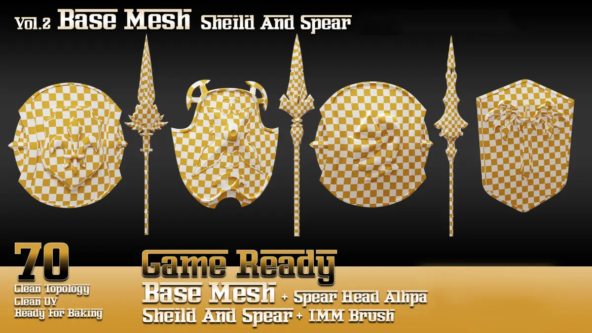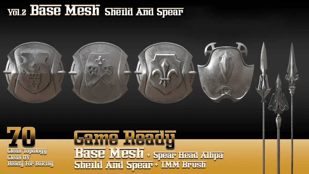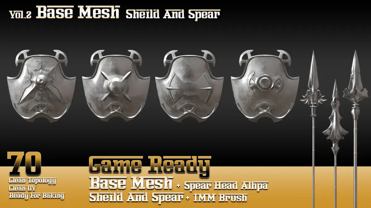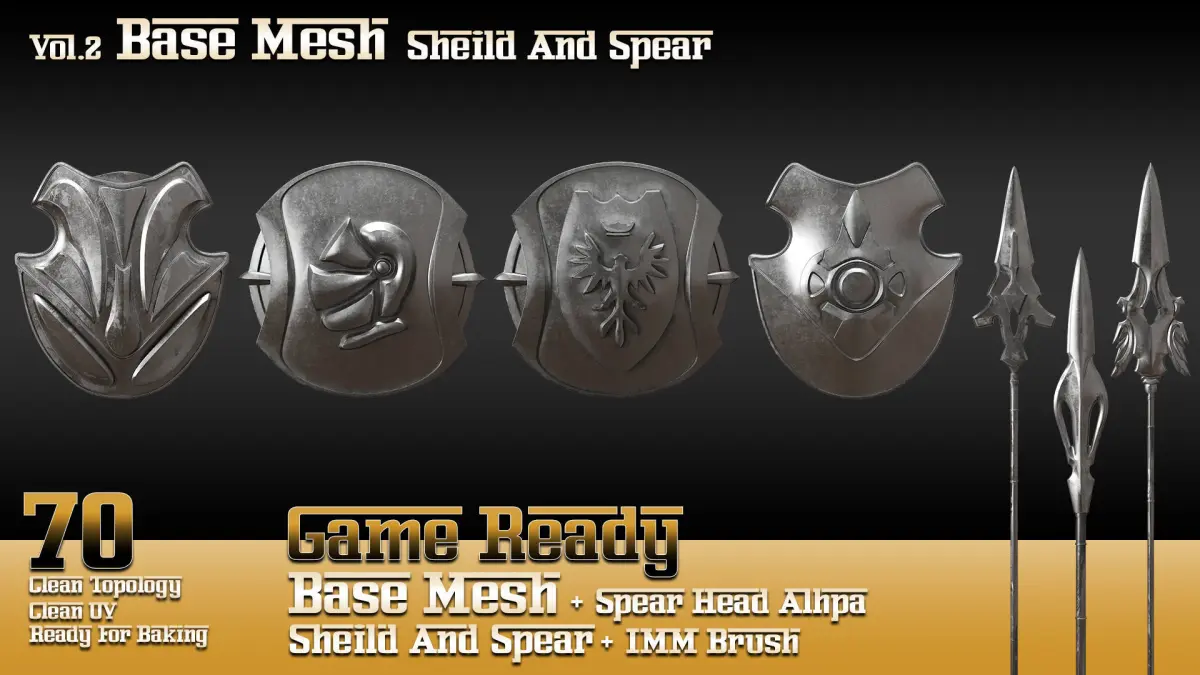 A Base mesh archive is needed to facilitate many projects, especially to save time. In response to this question, one should say that for most artists, this is an important matter.Therefore, such an archive is crucial for increasing the efficiency and quality of projects. A set of 70 Lowpoly Sheilds and Spears have been prepared in this package, and artists can work on the details to produce their desired LowPoly and HighPoly models. Models already have UVs for baking, though all are under 10k tri and ready for use with each game engine.