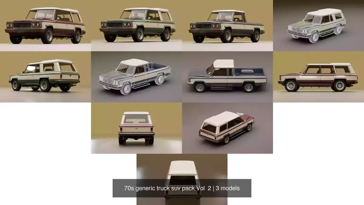 About pack: Pack contains 70s style generic SUV's/Pick-up trucks. The task was to create models that will be used as a game assets or to fill the backgrounds of the scenes. Design of the models were inspired by 70s muscle cars and american cars.