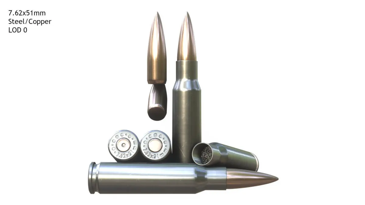 7.62x51mm rimless bottlenecked Cartridge developed in 1950’s. Mostly replaced by the 5.56x54mm cartridge as primary standard Nato cartridge but still largely used by Battle Rifles, Machine Guns and Marksman Rifles due to better performance at long range engagements.