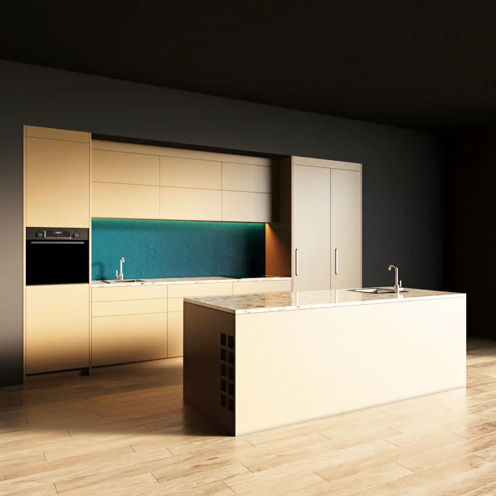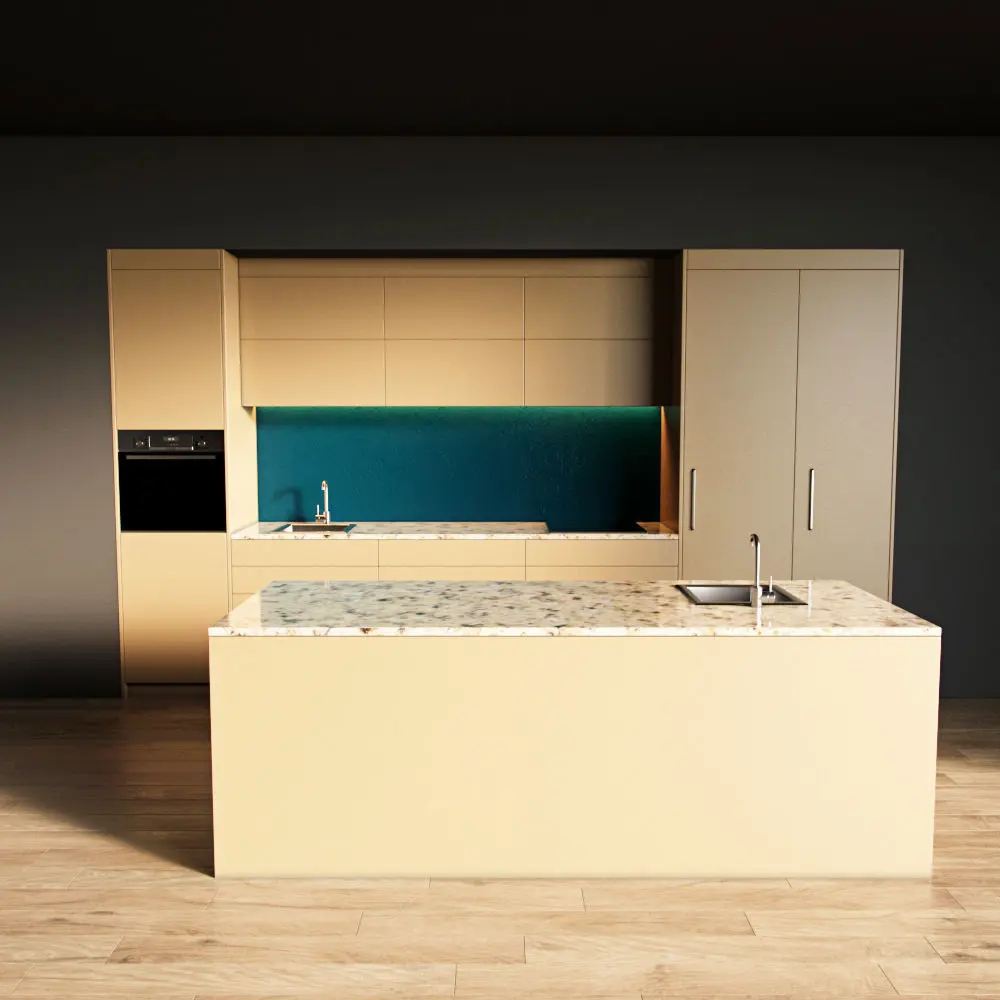 Only the kitchen and the island are present in the scene. The floor, walls, ceiling are yours.