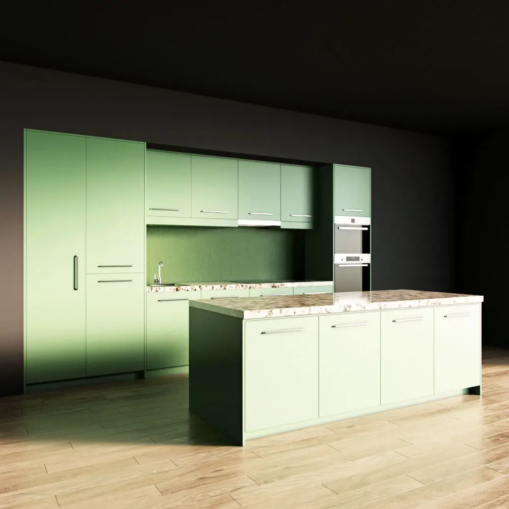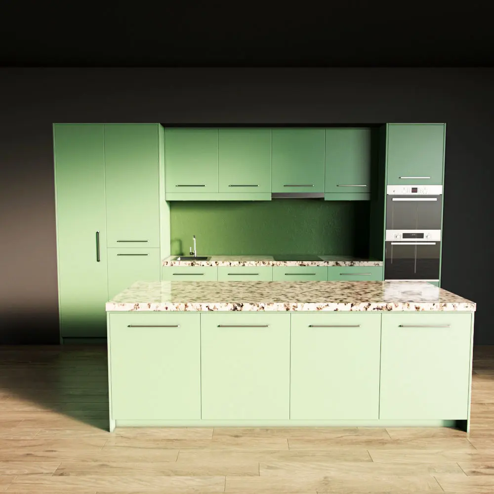 Only the kitchen and the island are present in the scene. The floor, walls, ceiling are yours.