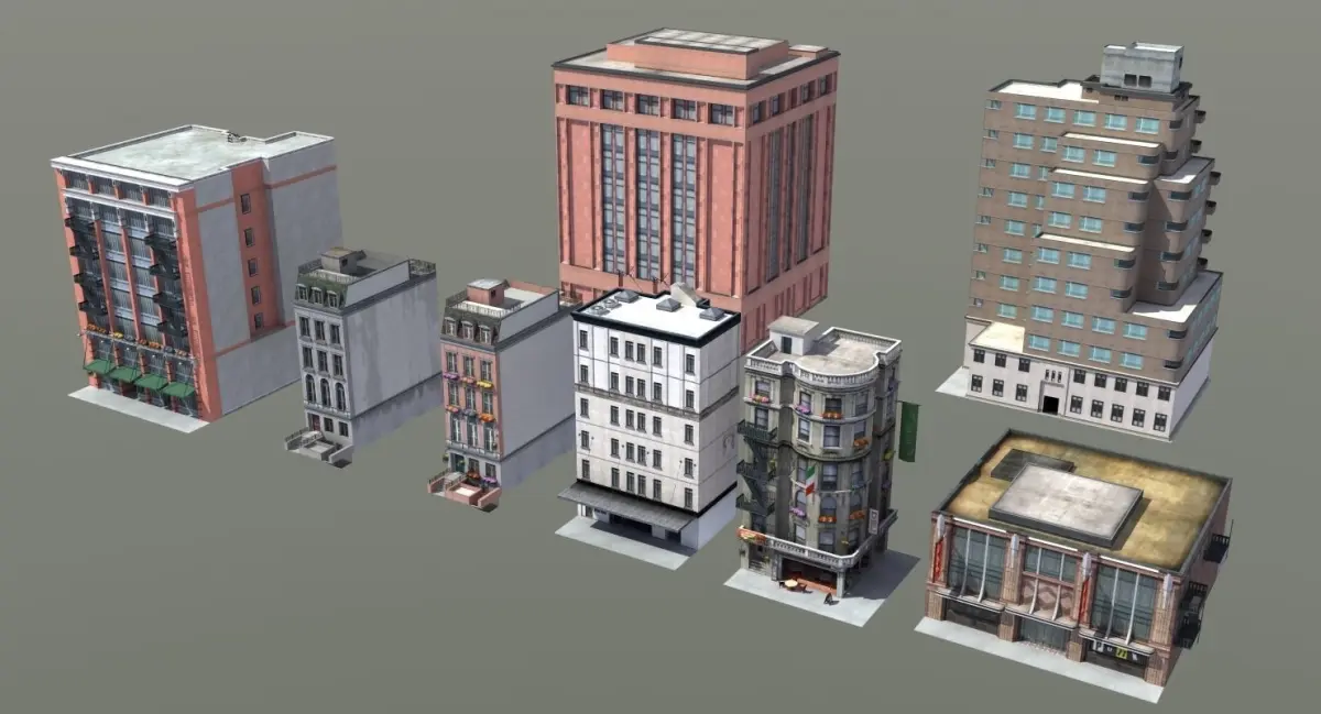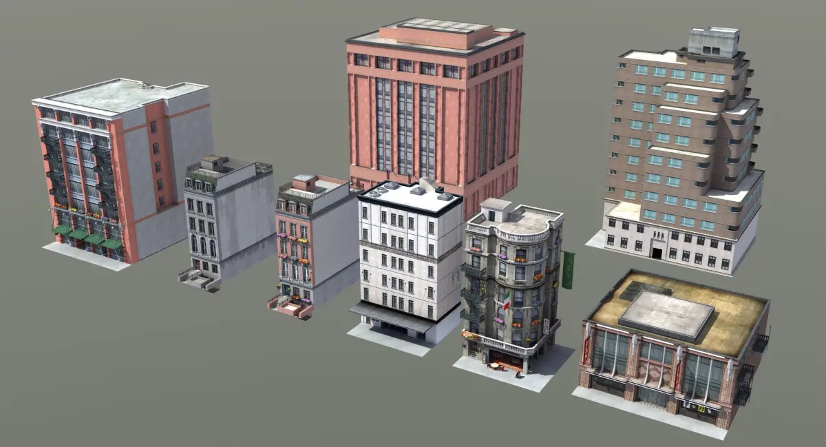 Collection of 8 city buildings. Great multipurpose 3D models (ideal for offline rendering or real time uses such as games or simulation).