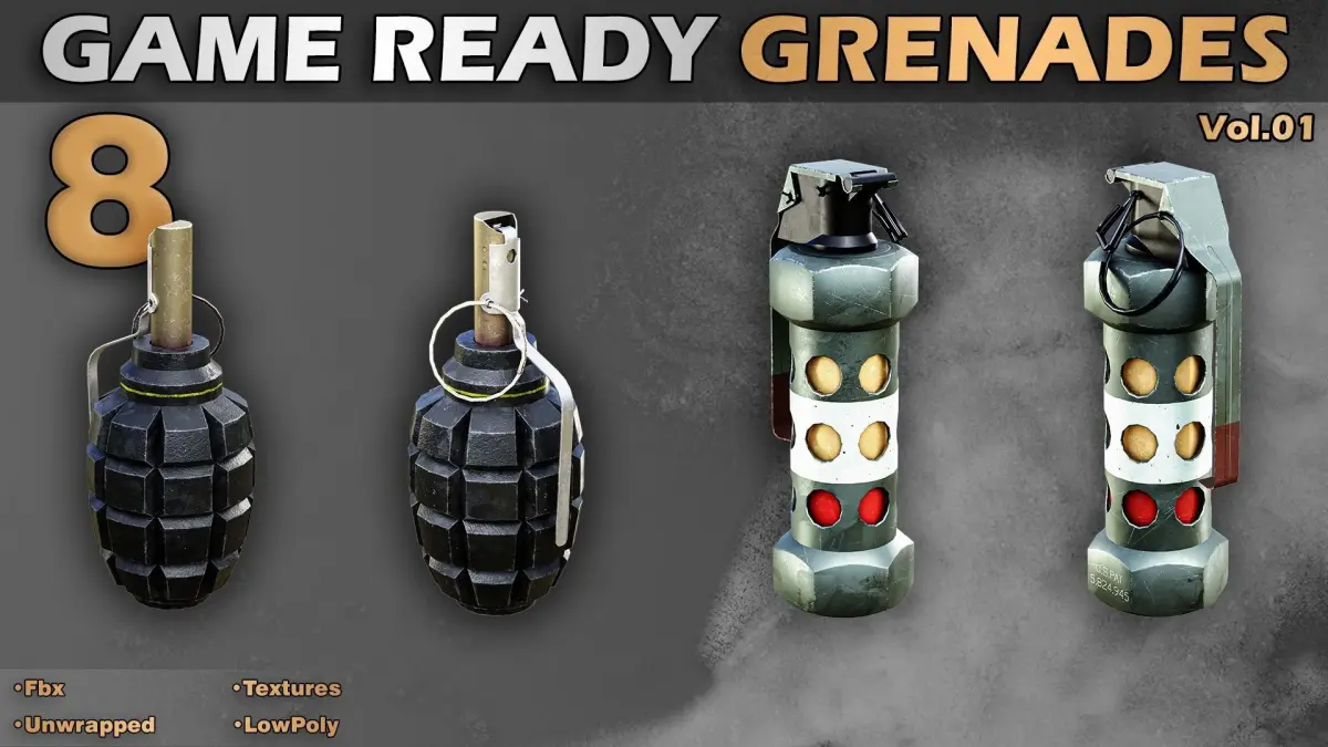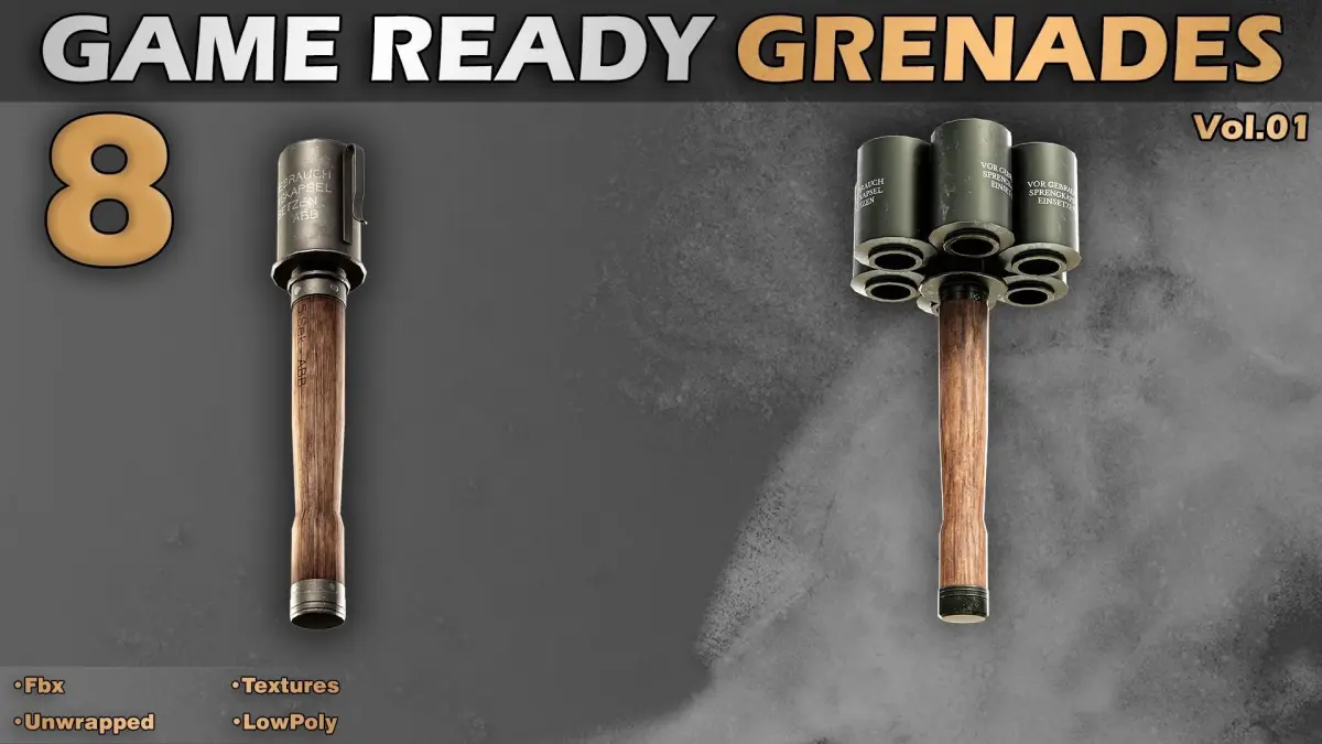 Are you looking for different kinds of grenade 3dmodels for your project? Then this pack is for you... 8 Lowpoly assets (3k Triangles average) that you can use in your projects with the most quality. The range of poly is between 2K & 4K. There are different kinds of grenades like M67, Stick Grenade, Flash Bang, Tear Gas & etc. This pack contains Fbx + 4K Textures