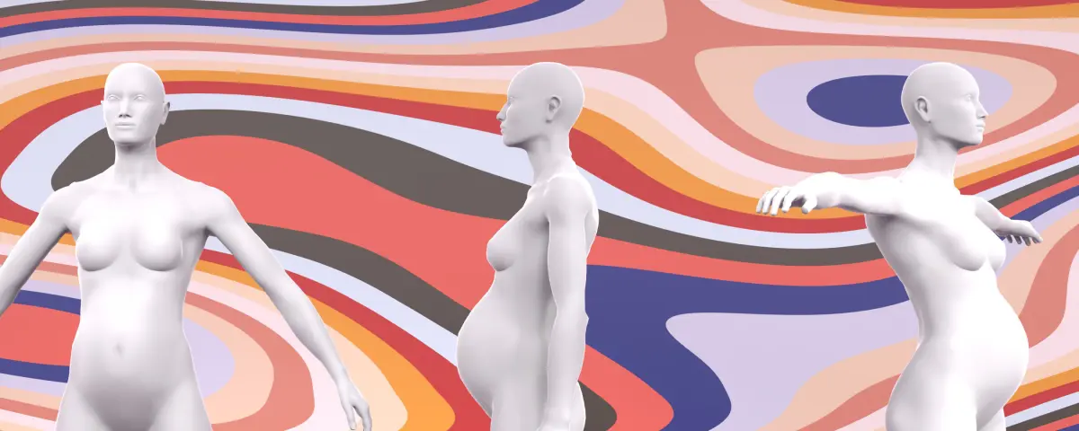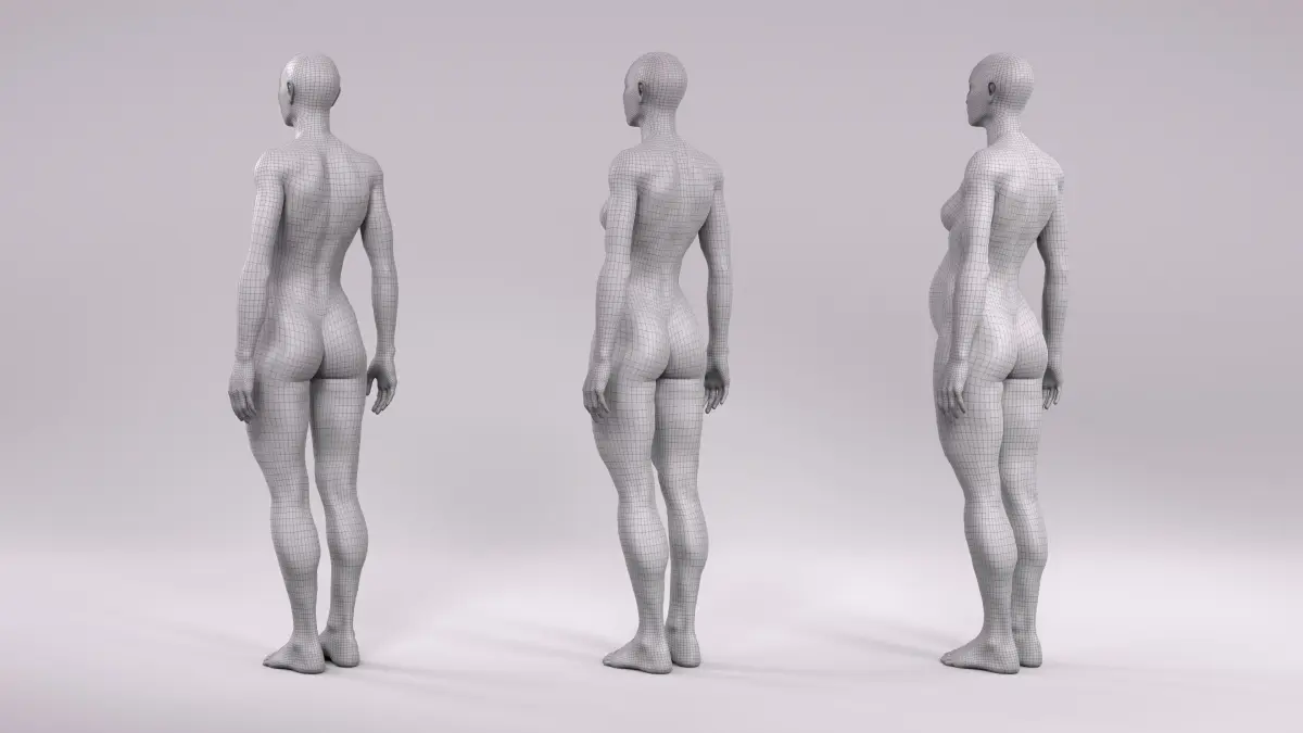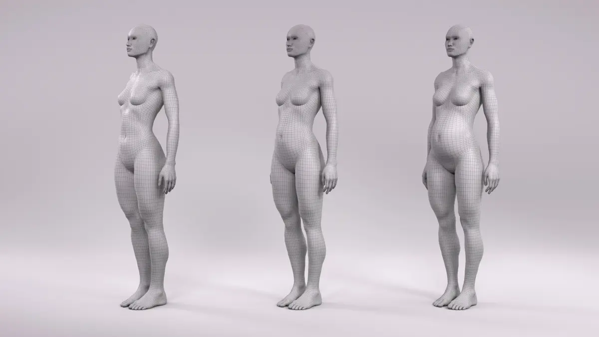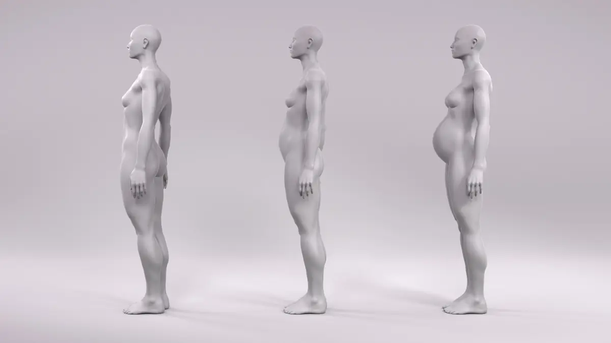 The gray images visualize the size difference between the normal mannequin (not included), 4 months pregnant mamaquin (not included), and 8 months pregnant mamaqin, as well as the topology.