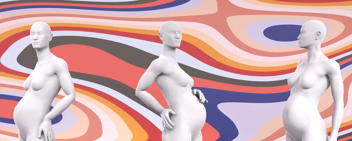 The gray images visualize the size difference between the normal mannequin (not included), 4 months pregnant mamaquin (not included), and 8 months pregnant mamaqin, as well as the topology.
