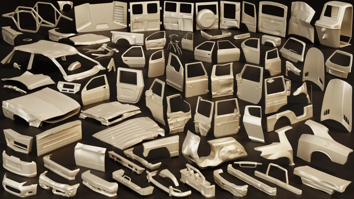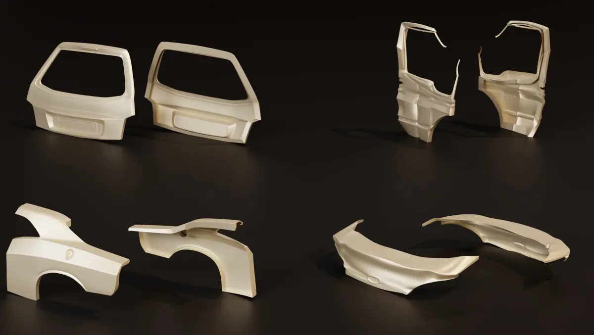 Here we have a collection of exterior car body parts which some of them are damaged.