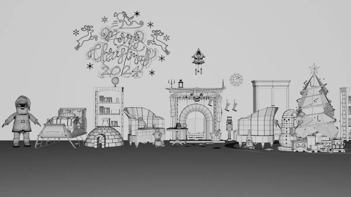 Items(x80)Santa, Igloo, Cookies, Gingerbread, Gift, Nutcracker, Sleigh, Candle, Fireplace, Chair, Table, Snowflake, Hand bell, Ornament, Snowman, Clock House, Toy Train, Toys, Fireworks, Lollipop, Candy Cane, Bell and many more
