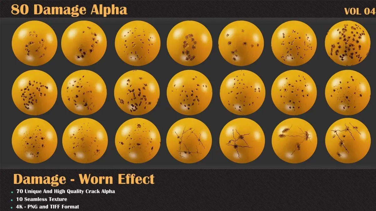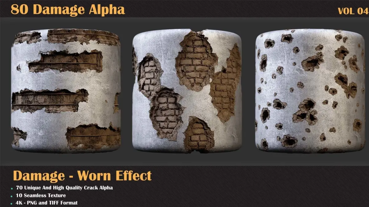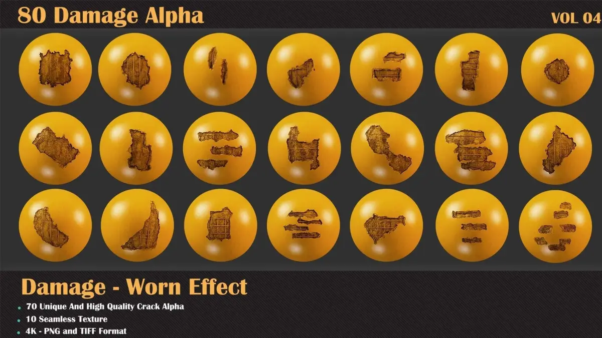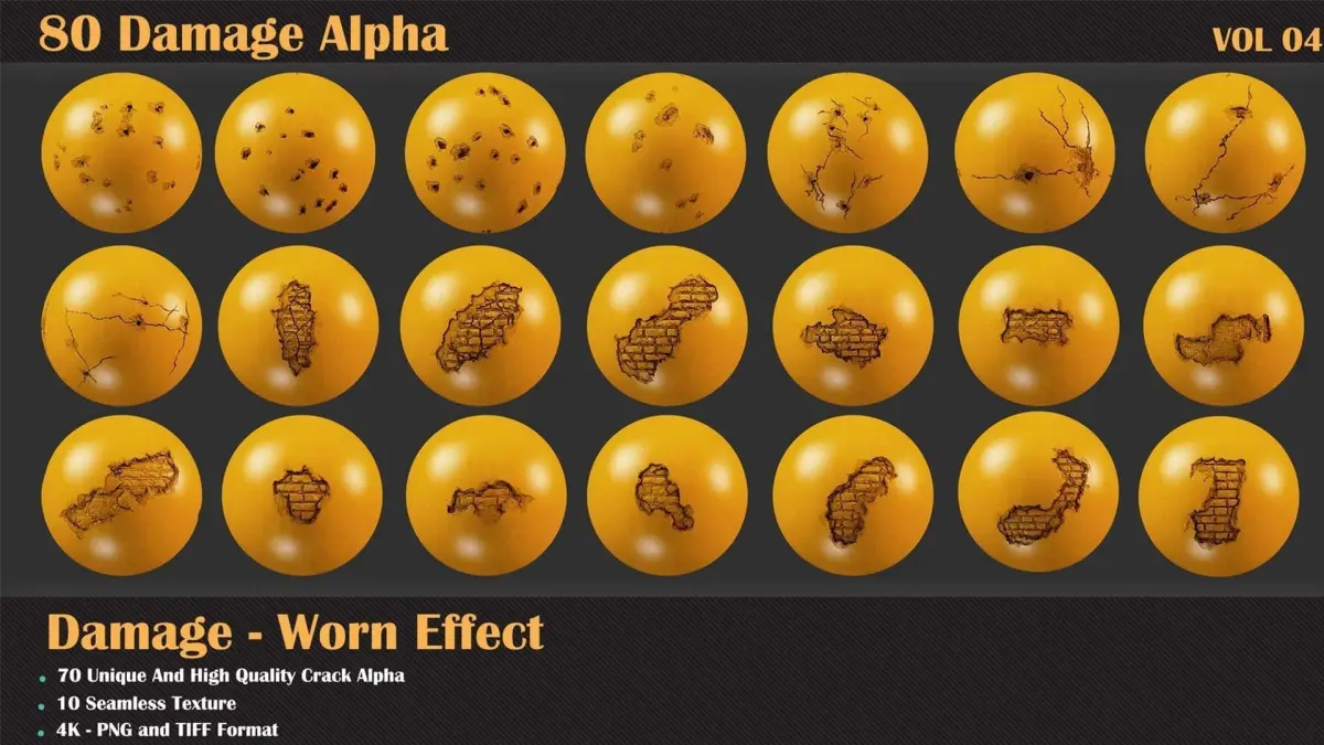 70 Damage and Holes Alpha + 10 Seamless Damage texture in PNG 16 Bit 70 Damage and Holes Alpha + 10 Seamless Damage texture in TIFF 16 Bit 70 Damage and Holes Alpha + 10 Seamless Damage texture in PSD 16 Bit All Textures Have 4K Qualityhttps://youtu.be/S0BwjjVeTZEPreview for each Alpha
