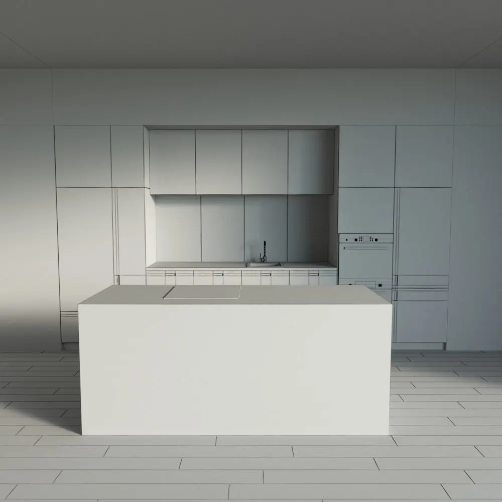 Only the kitchen and the island are present in the scene. The floor, walls, ceiling are yours.