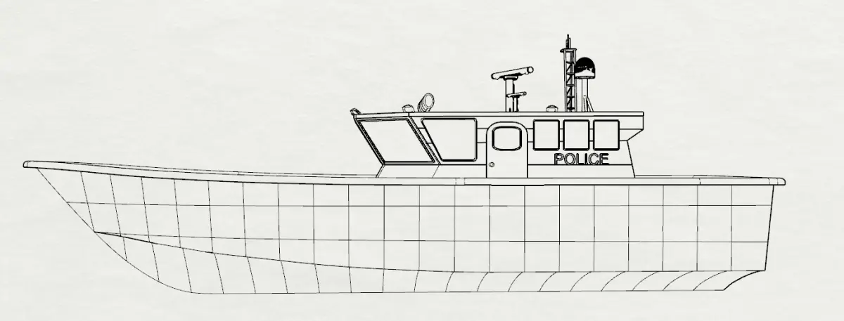 This is a highly detailed 3D model of a modern police patrol boat designed using Rhino 3D by a marine engineer. The model represents an 8-meter vessel with a 3.5-meter beam, featuring an accurate and realistic structure suitable for real-time applications.