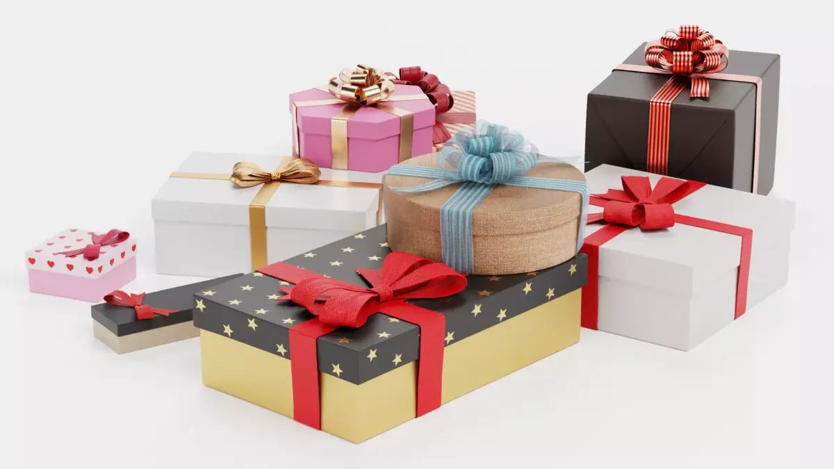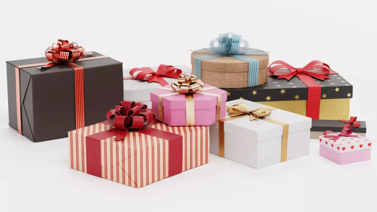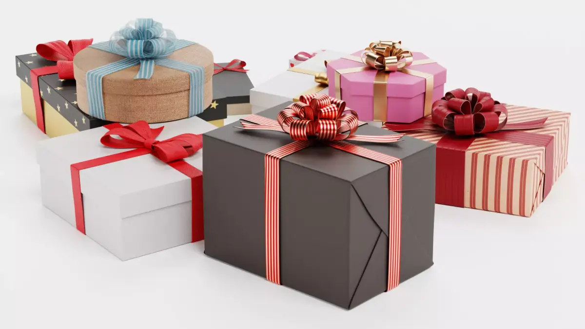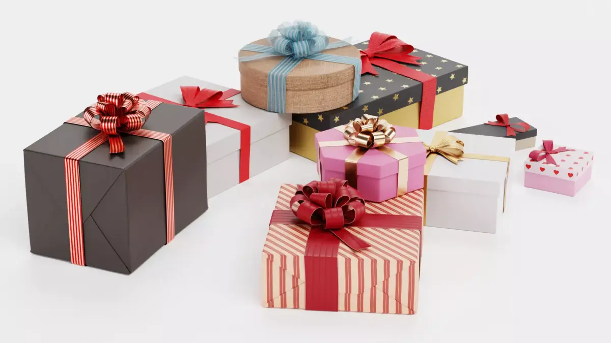A versatile collection of a wrapped gift boxes pile in a variety of shapes and sizes, designed for festive or general celebratory use. The set includes round, square, hexagonal, small jewelry boxes, and elongated forms, each detailed with decorative bows, ribbons, and subtle printed patterns. Some boxes are wrapped in paper showing realistic folds, while one features a natural jute-like material for a tactile, organic touch.