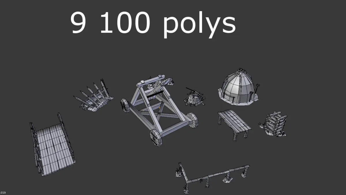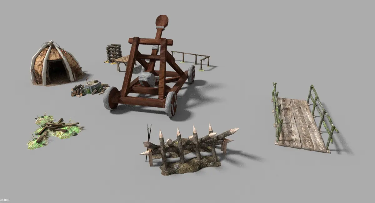 This collection contains 9 various medieval props.-tent-wooden pile-pile-catapult-table-fence-bridge-palisade-stump