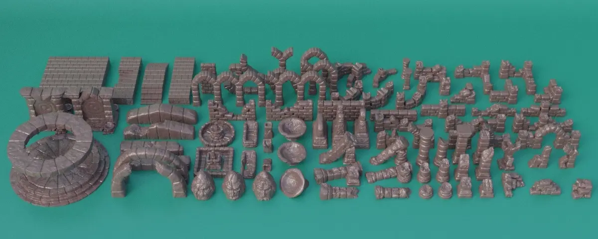 This pack will have 90 different parts for you to create your unique modular ruin. Adjusted to 28 mm miniatures Inside can be playable FDM Print preferred (Gray good ) No need to slice adjusted to Ender 3 pro v2 standarts