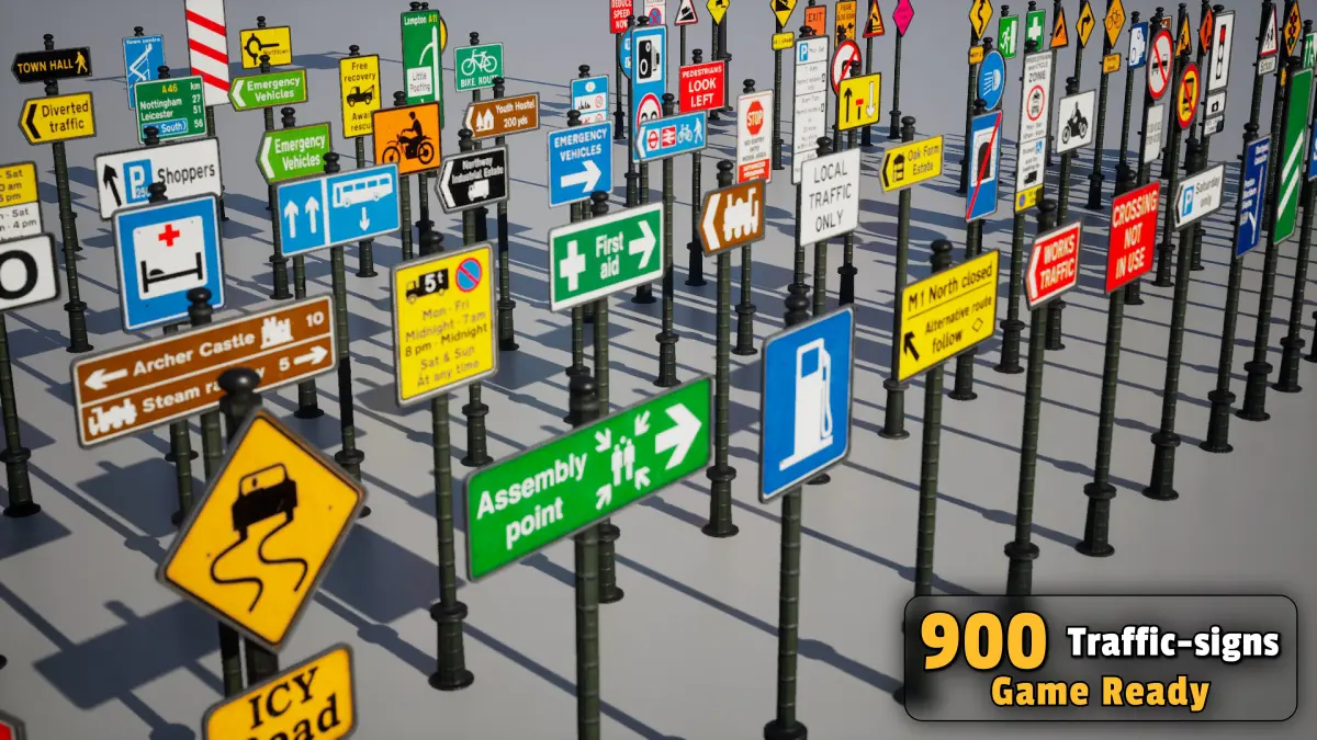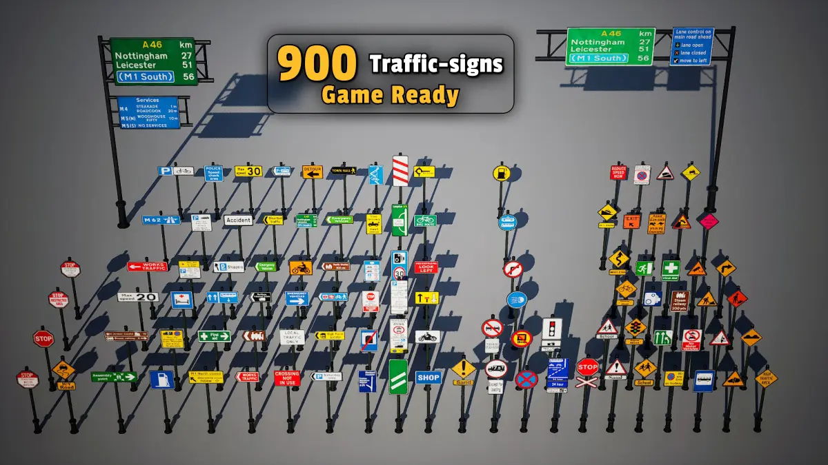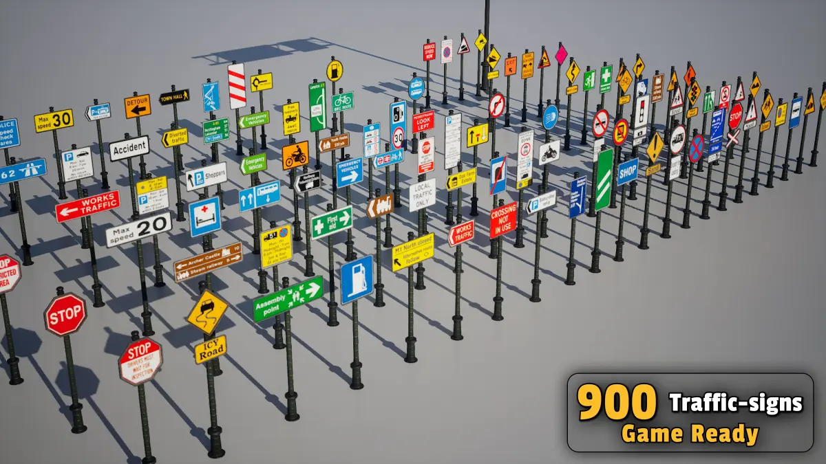 Are you looking for a collection of traffic signs that are fully optimized for use in games and interactive environments? This pack includes 900 highly detailed models with diverse textures, allowing you to bring your game environments to life with greater realism and precision.