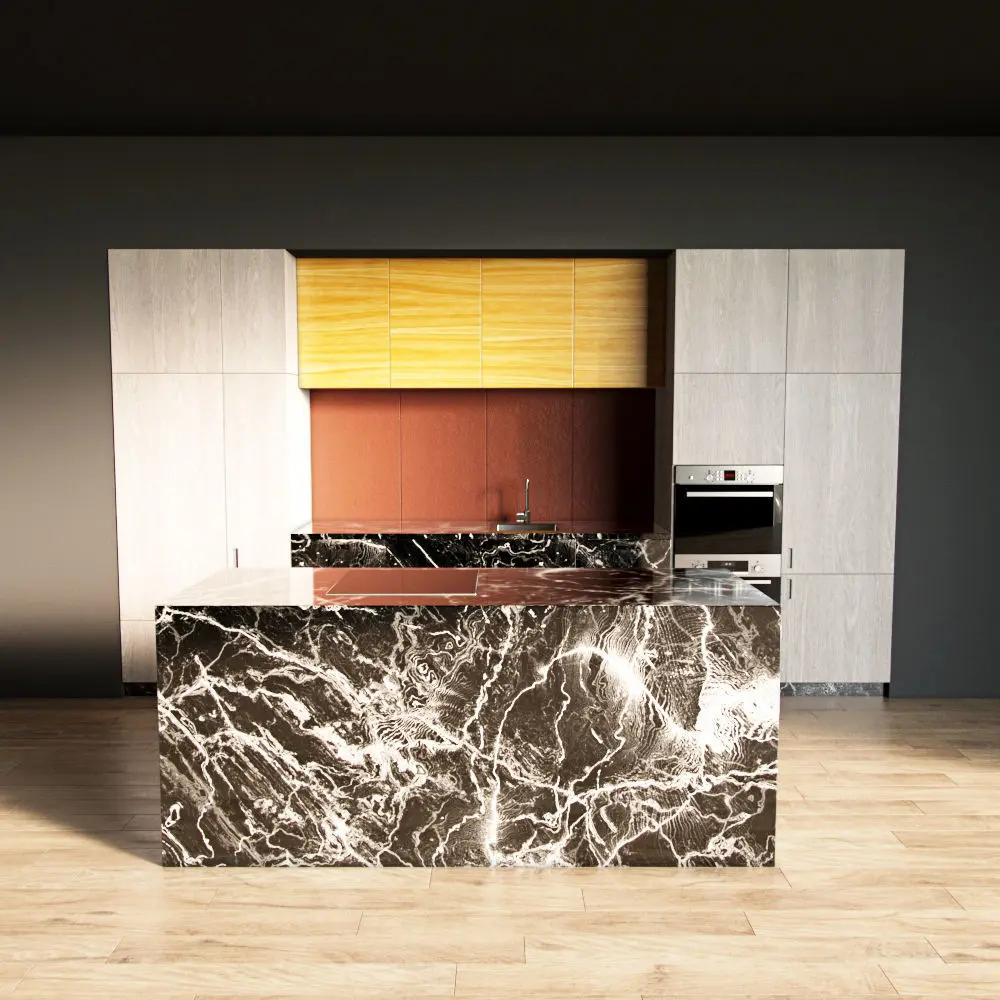 Only the kitchen and the island are present in the scene. The floor, walls, ceiling are yours.