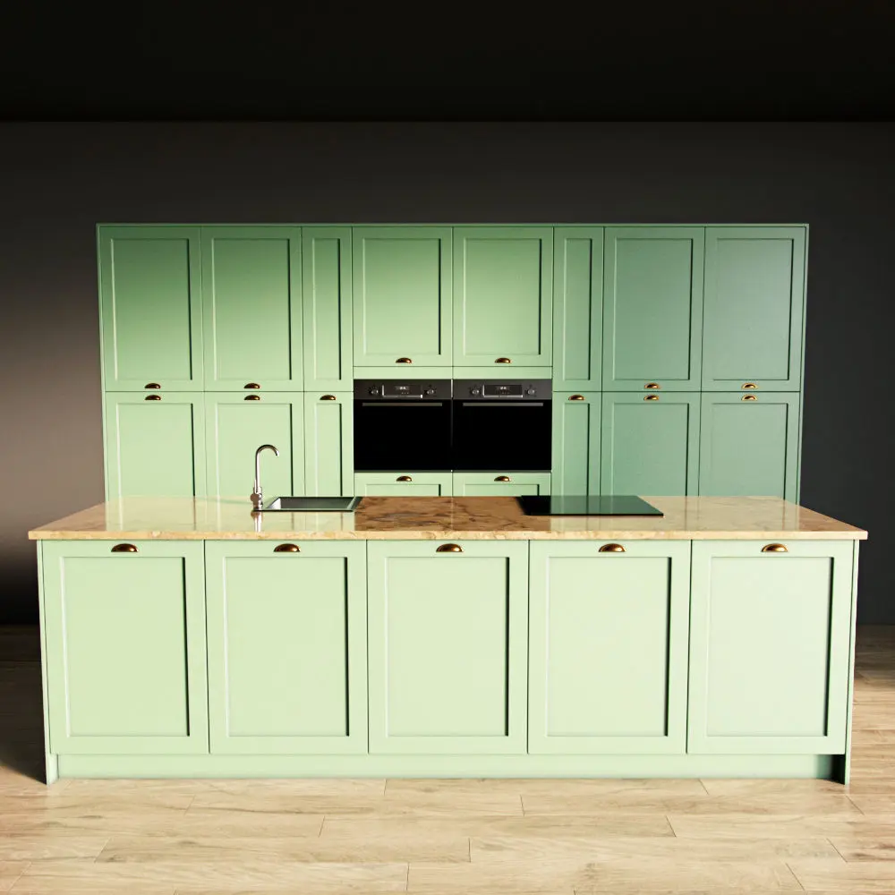 Only the kitchen and the island are present in the scene. The floor, walls, ceiling are yours.