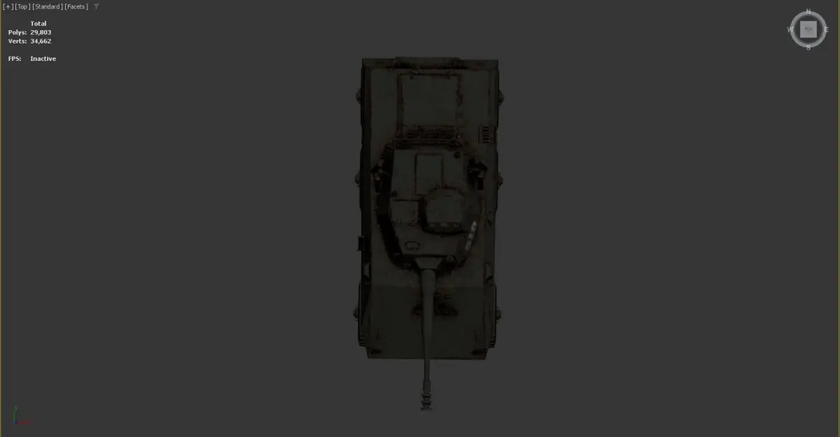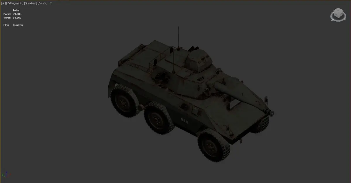 a 3D wireframe model of a military armored vehicle with six wheels. The model is displayed in an orthographic view with standard facets and edged faces. The vehicle has a turret on top, various antennas, and other detailed components. The statistics on the left side of the image indicate that the model consists of 29,803 polygons (Polys) and 34,662 vertices (Verts). The FPS (frames per second) is marked as inactive.