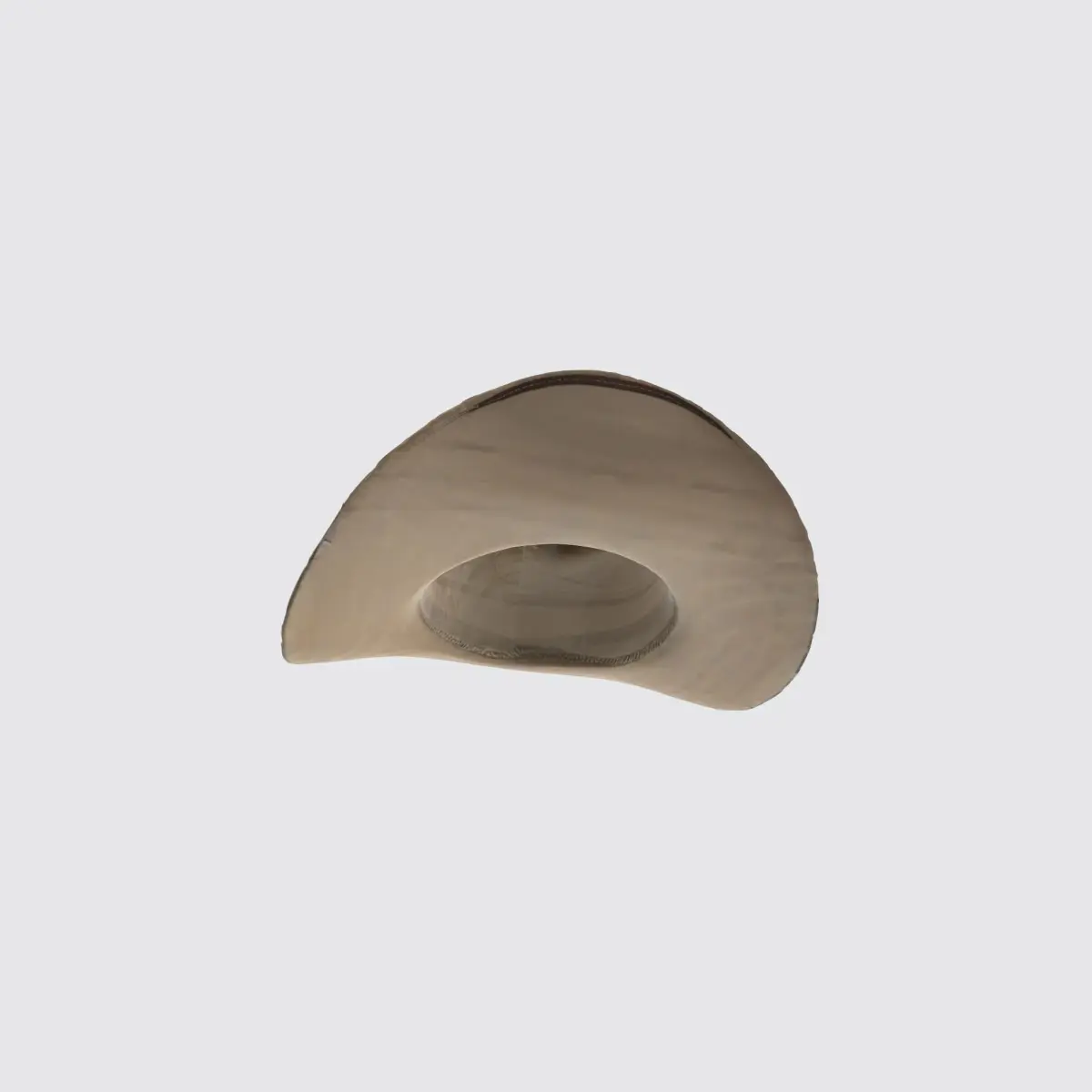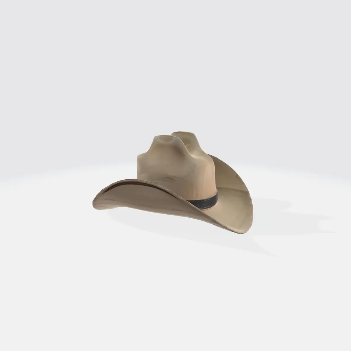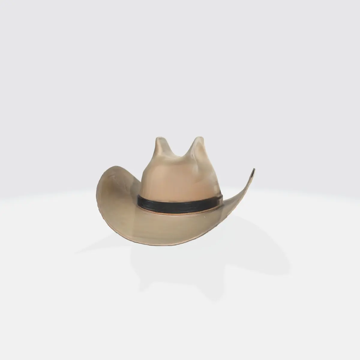a cowboy hat, which is a traditional accessory often associated with the American West. The hat is beige with a black band, and it appears to be made of a smooth, possibly leather-like material. The brim of the hat is curved upwards, and the top of the hat has two pointed ears, which is a characteristic design element of cowboy hats. The hat is positioned against a plain, light-colored background, which puts the focus entirely on the hat.
