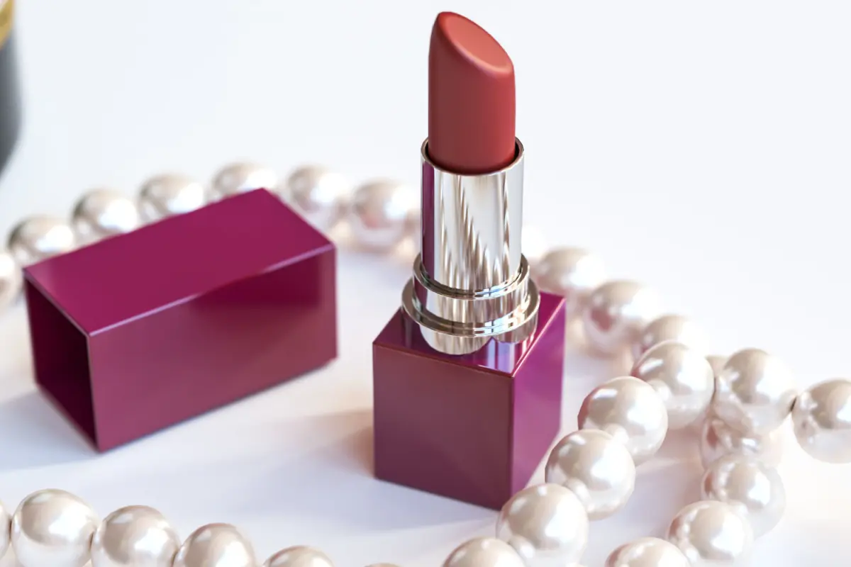 A bottle of champagne with glass next to pearls and red lipstick.
