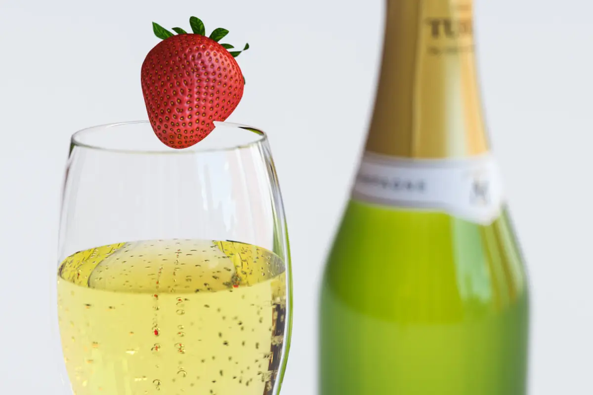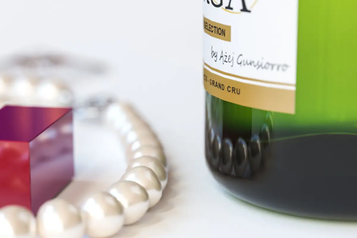 This 3D model includes luxury set a bottle of champagne and with a full glass. Next to bottle standing the red lipstick in classic form and string of pearls.
