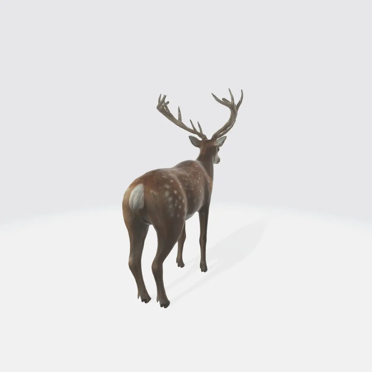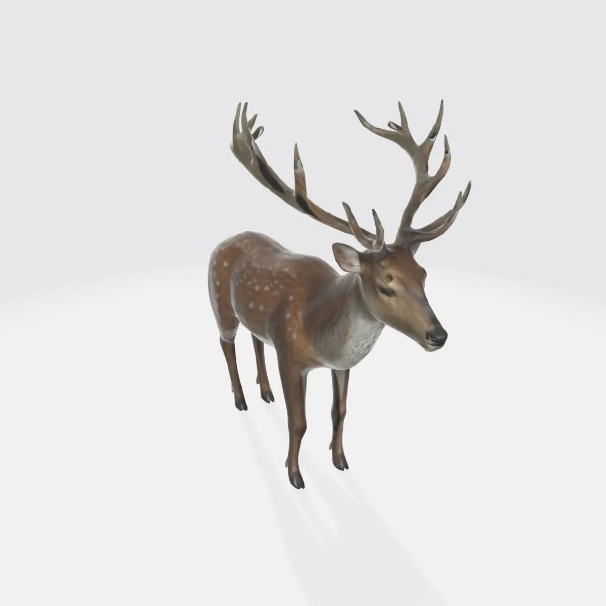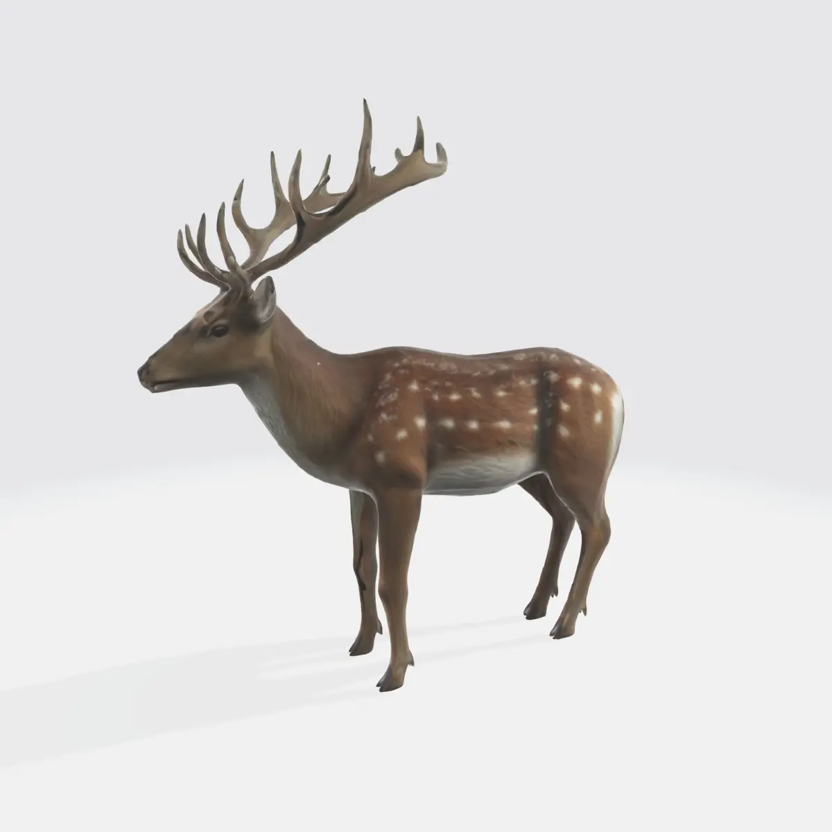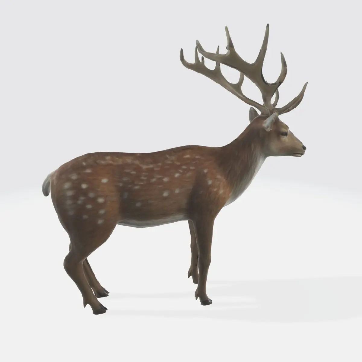 a deer with a prominent set of antlers. The deer has a realistic appearance with detailed textures and shading, giving it a lifelike quality. The antlers are long and curved, with multiple tines, and the deer's body is brown with white spots, typical of a fawn. The deer is standing on all fours, facing slightly to the left, and appears to be in a calm and relaxed posture.