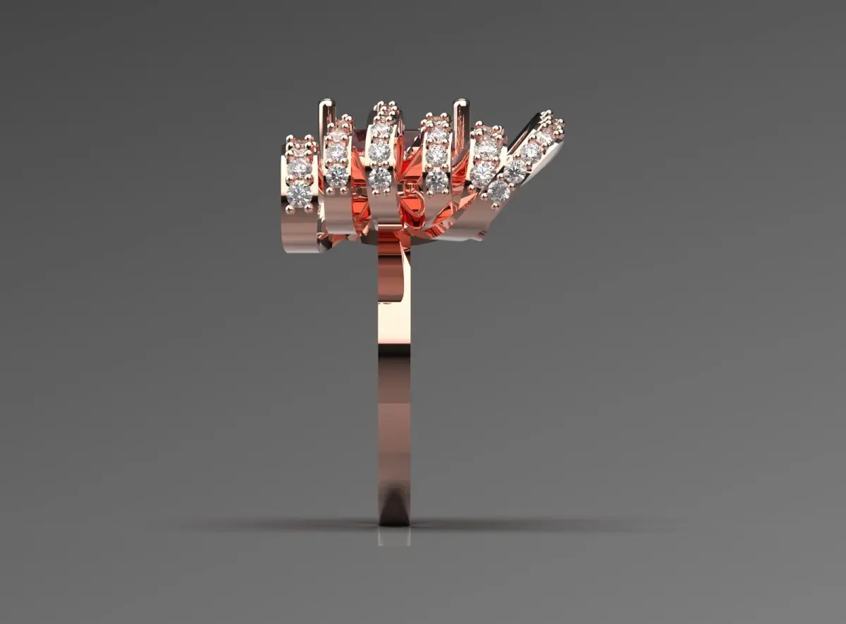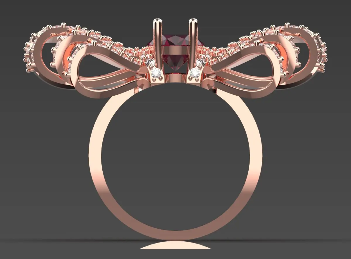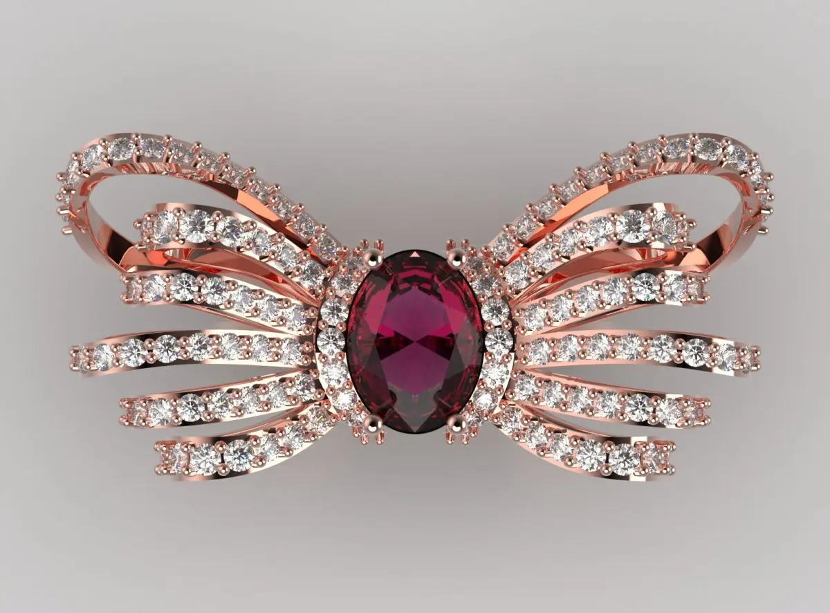 Metal type: Rose gold (exact measurement can be provided, e.g. 14K or 18K) with a polished finish.Center Stone: Natural Ruby with Oval Cut and Approximate Weight (Example: 1.5 - 2.0 Carats). Color: Vivid Red or Deep Red.Side Stones: Natural Diamonds with Round Brilliant Cut.Diamond Quality: Clarity SI1-VS2 and Color G-H.Approximate Number and Weight of Diamonds: (Example: 150-200 total diamonds with a total weight of 1.5-2.0 carats).Setting Type: Pave Setting for maximum sparkle.Design: Dynamic 3D butterfly design with diamond-encrusted wings.Prongs: Four sturdy and delicate prongs for the center stone.Ring Weight: (Example: Approximately 8-12 grams of gold, depending on size).Symbolism: The butterfly symbolizes change, growth, freedom, and beauty, and the ruby symbolizes love and passion.Why choose this ring?