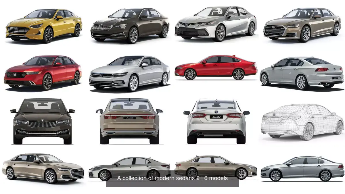 A collection of modern sedans. The kit includes: Audi A8 2018, Skoda Superb iV 2020, Honda Accord 2024, Toyota Camry Hybrid SE 2021, Hyundai Sonata 2020, Volkswagen Passat B8 (FL) 2020. The main elements are prepared for TurboSmooth smoothing (2 Iteration). The elements of the body, wheels, interior have been worked out - conditionally.