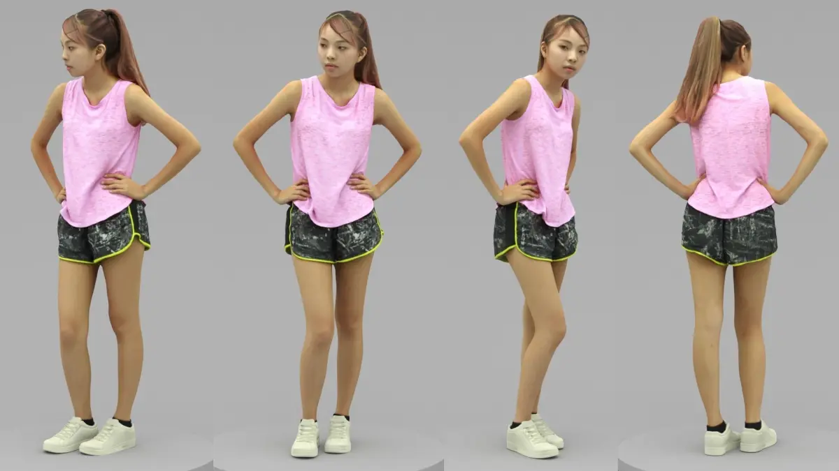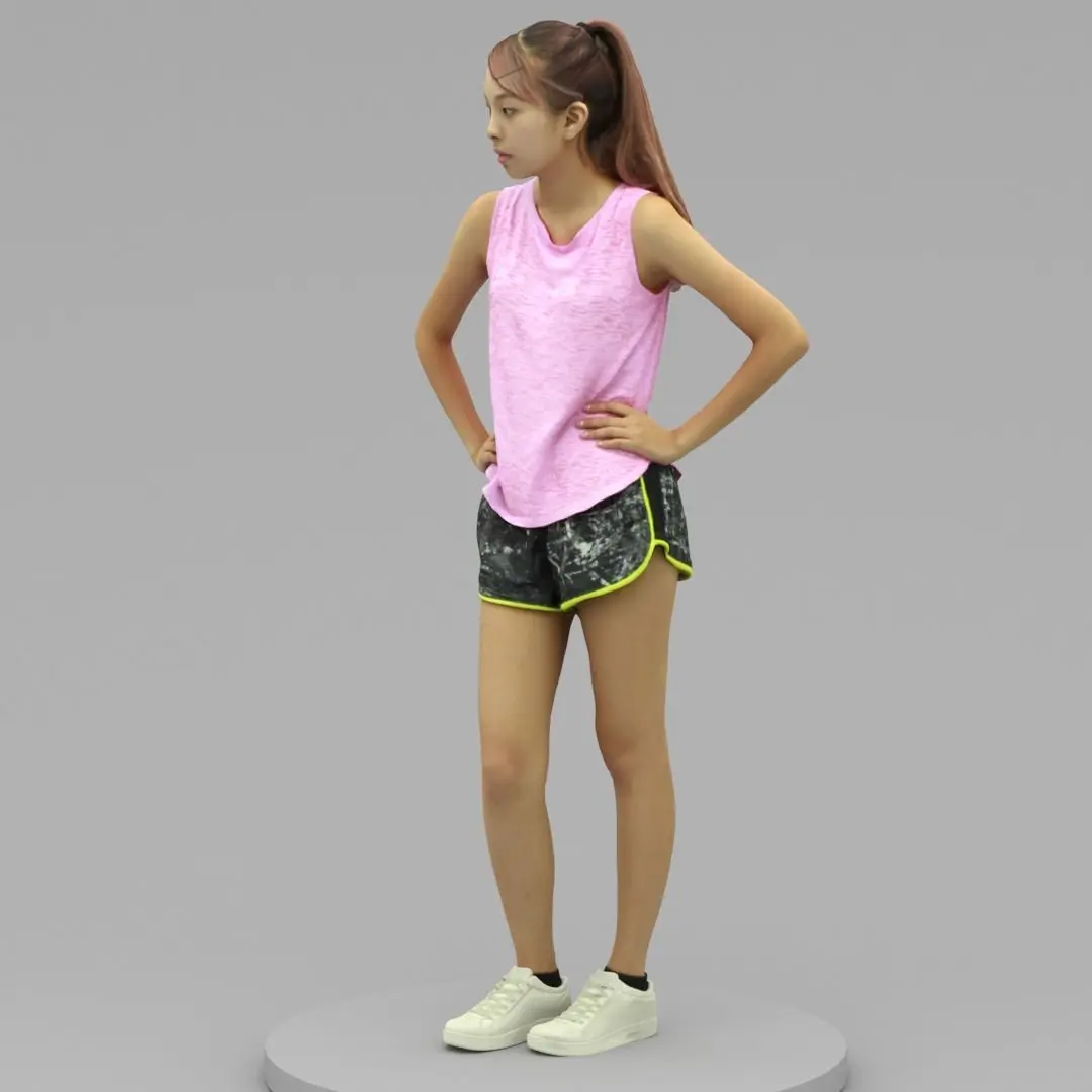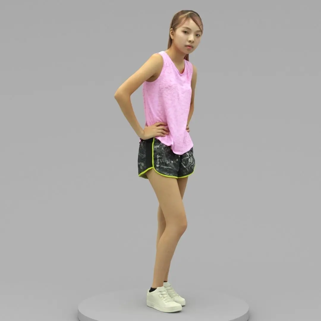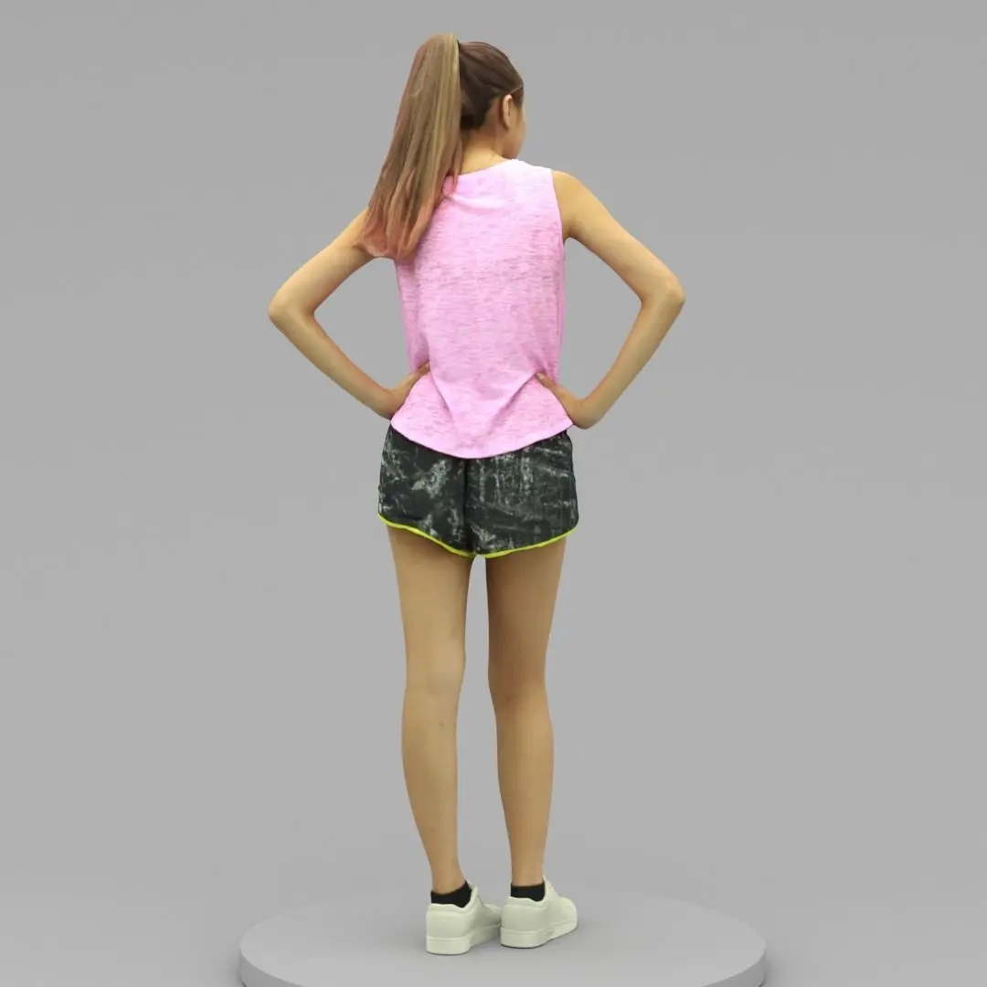A cool young woman posing in akimbo postureA cool young woman lady puts hands-on the waist in a pink t-shirt and shorts