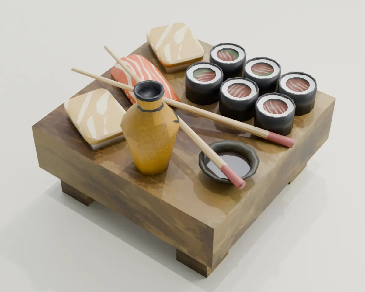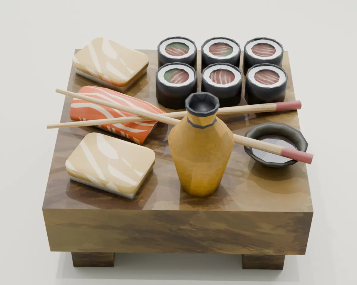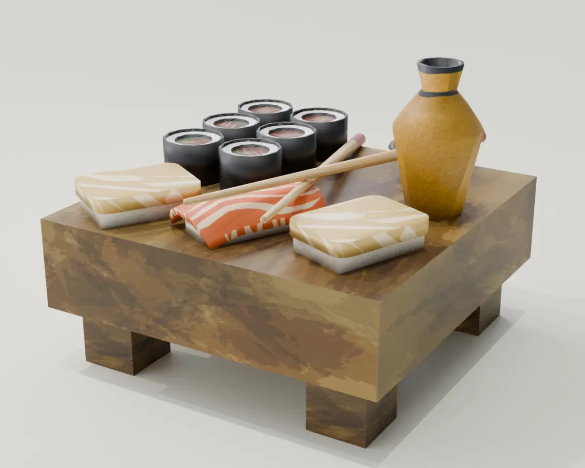 Sashimis:Three thin sashimi slices placed on a small, round plate next to the maki. The slices are slightly fanned out.Details: Simple, flat, oval shapes with a texture to represent raw fish.