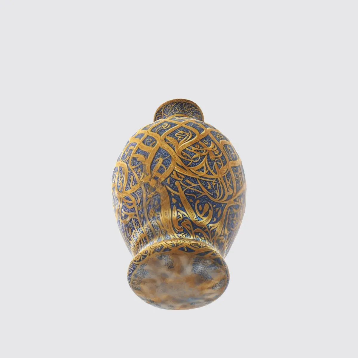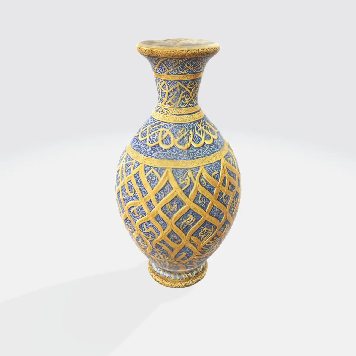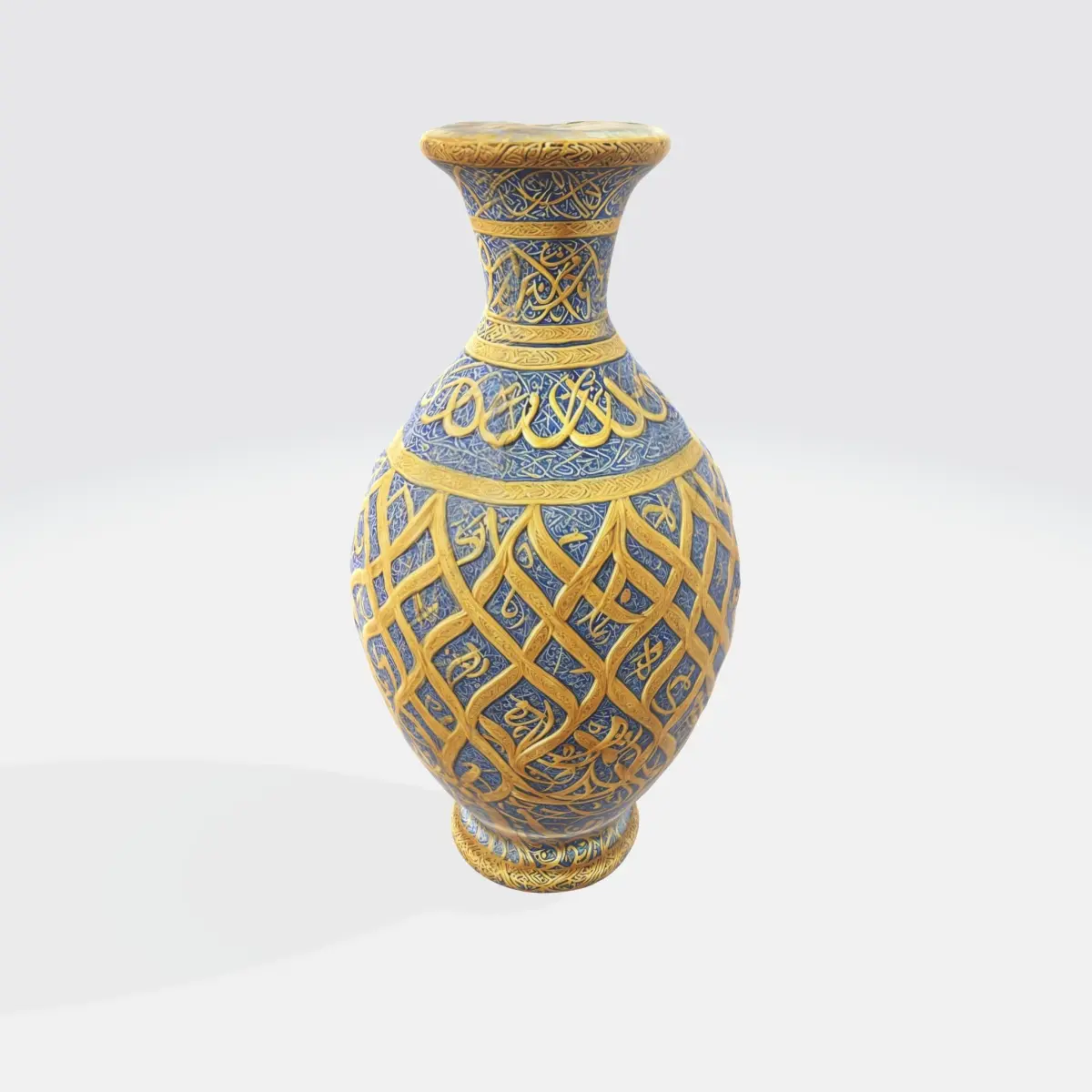 slender vase with a flared neck and a wide base. The vase is adorned with intricate blue and gold patterns that cover its entire surface. The patterns appear to be inspired by traditional Chinese motifs, with a repeating design that includes interlocking shapes and possibly floral elements. The color palette is limited, with the blue and gold tones providing a striking.