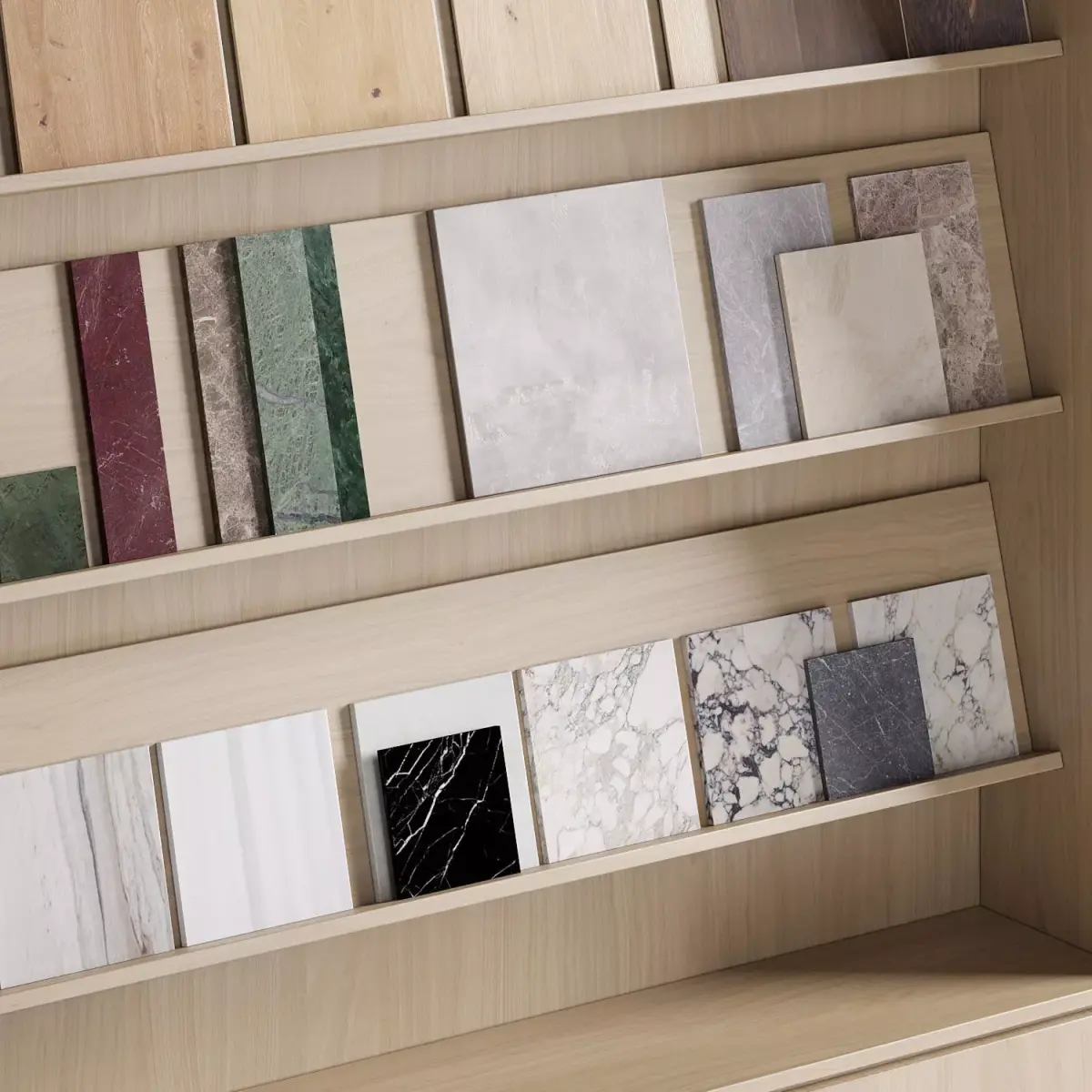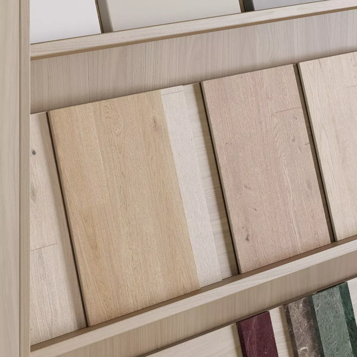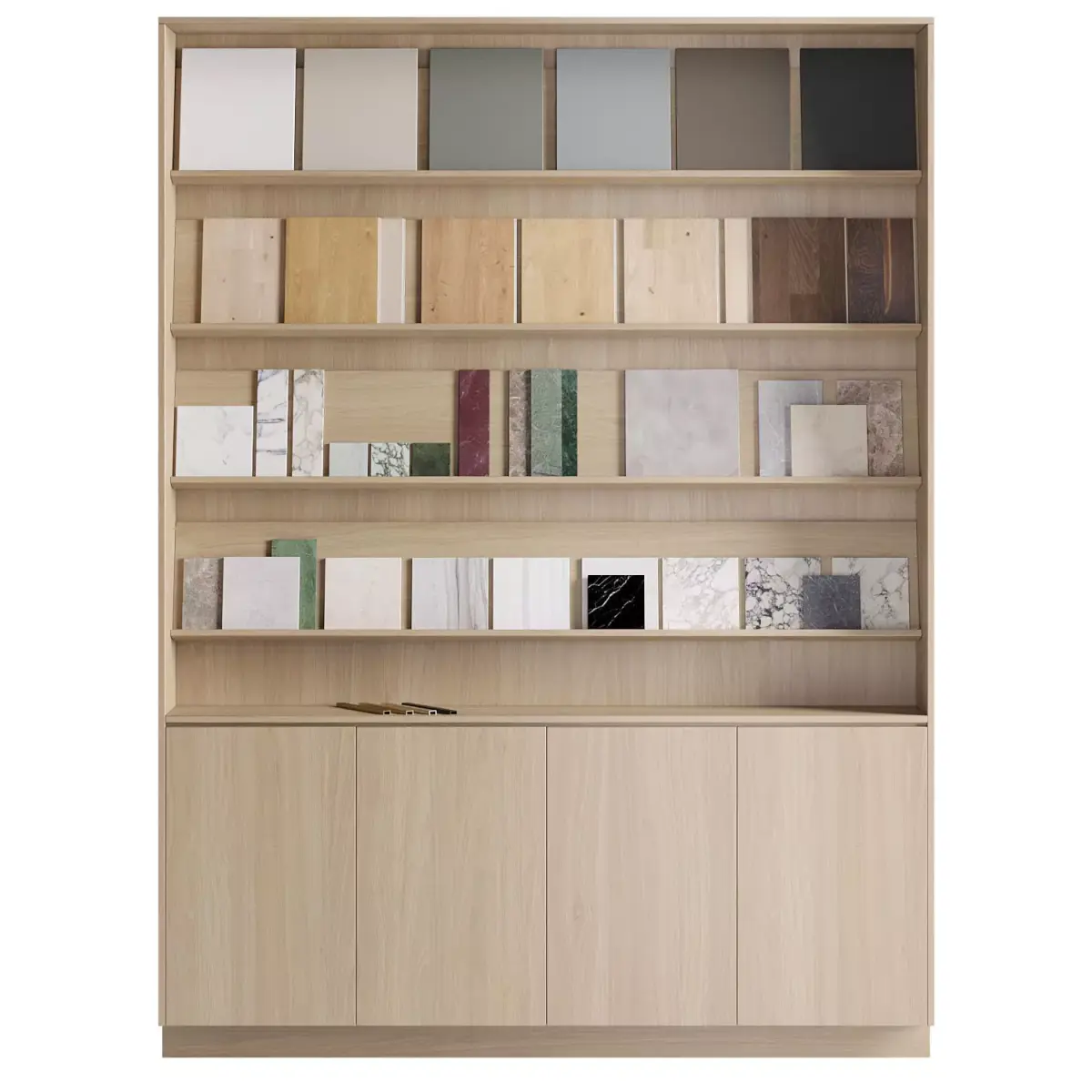 A display stand with samples of finishing materials for interior design studios and real estate showrooms.