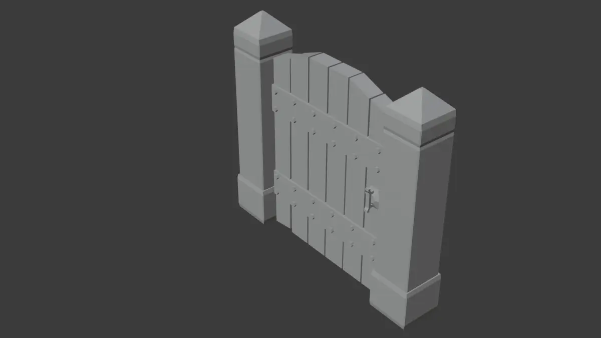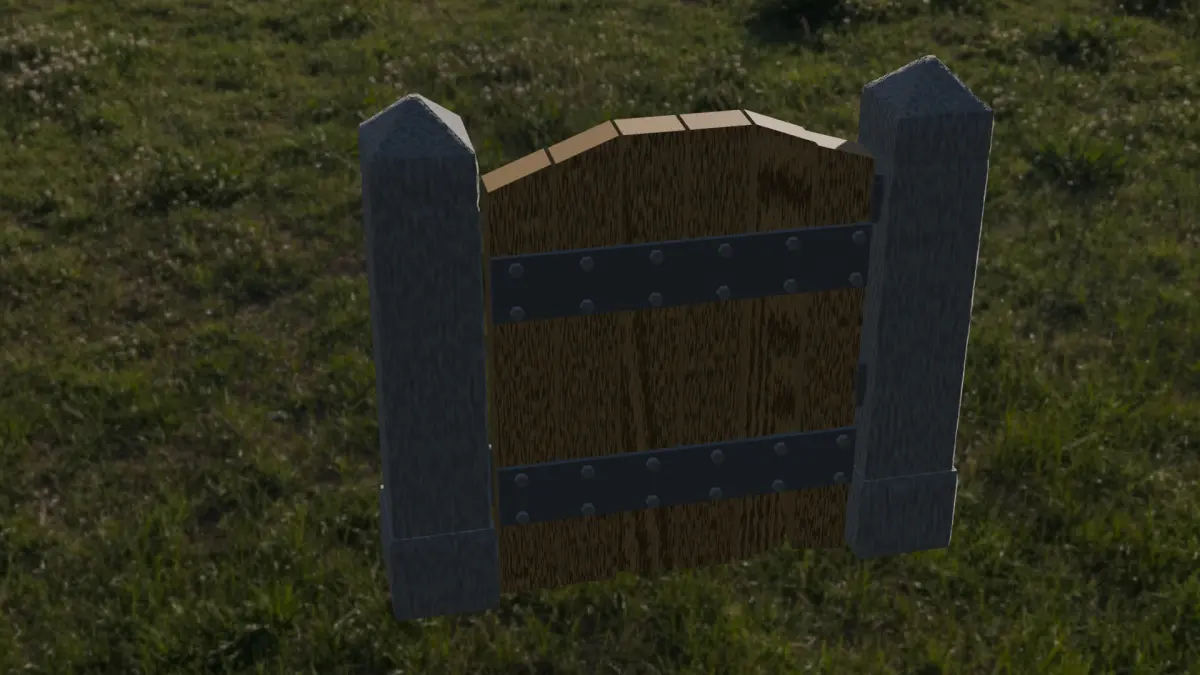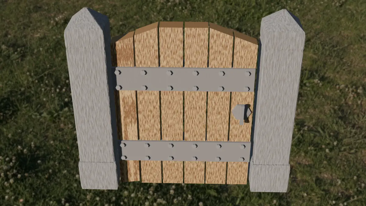 This is a high-quality 3D model of an old-style wooden door, designed for use in courtyard entrances. The model features detailed textures and includes wooden, metal, and stone elements for added realism. Optimized for use in real-time engines like Unity or Unreal Engine. Ideal for historical or medieval scenes.
