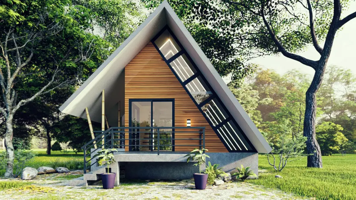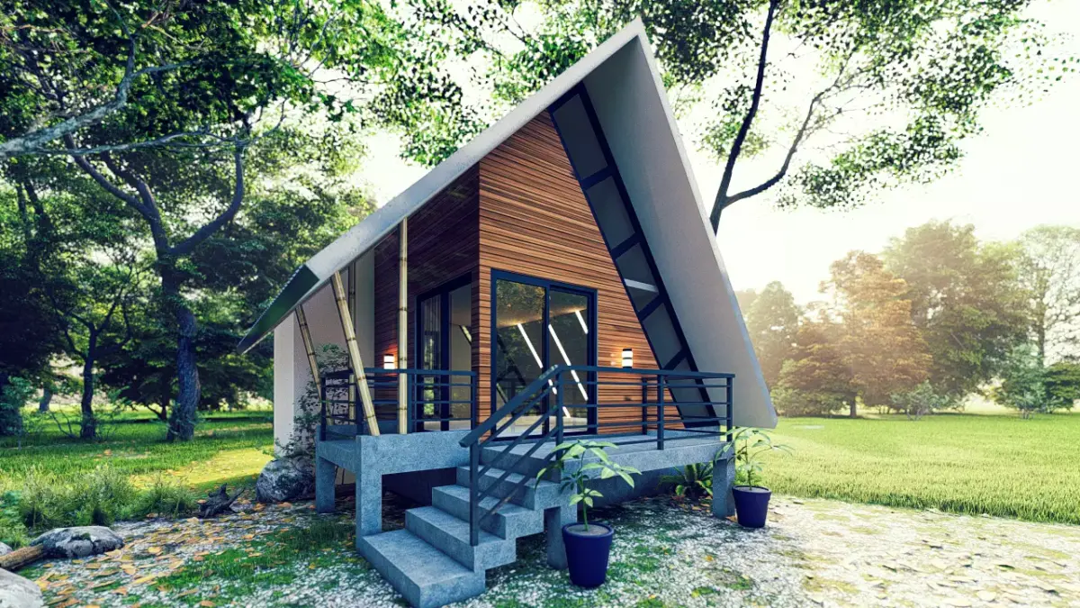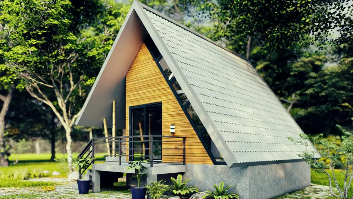 This 3D model presents a modern A-frame house with a spacious terrace, designed for stylish yet compact living. The project blends minimalist architecture with functional outdoor space, making it ideal for both residential use and vacation retreats.