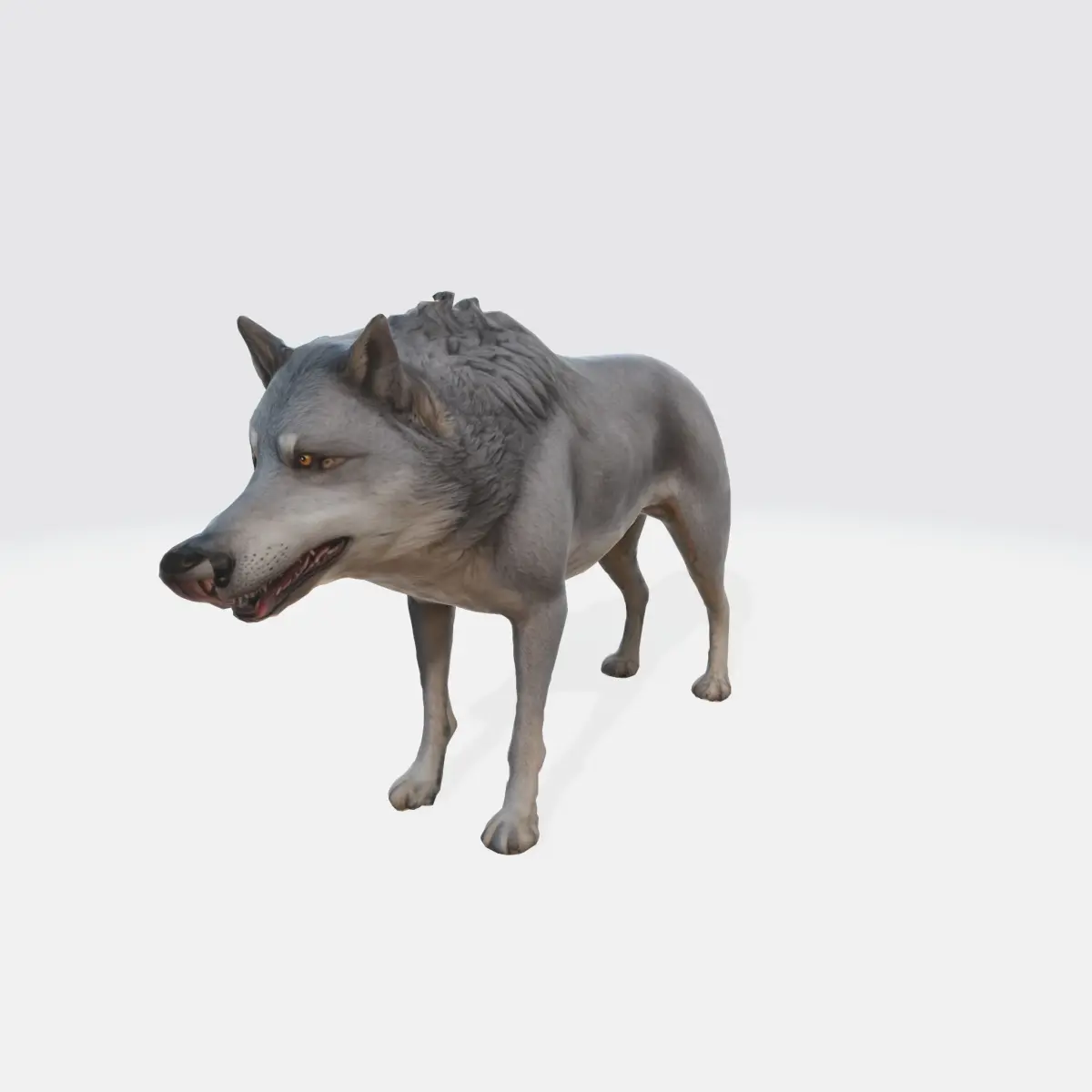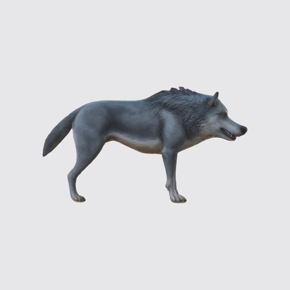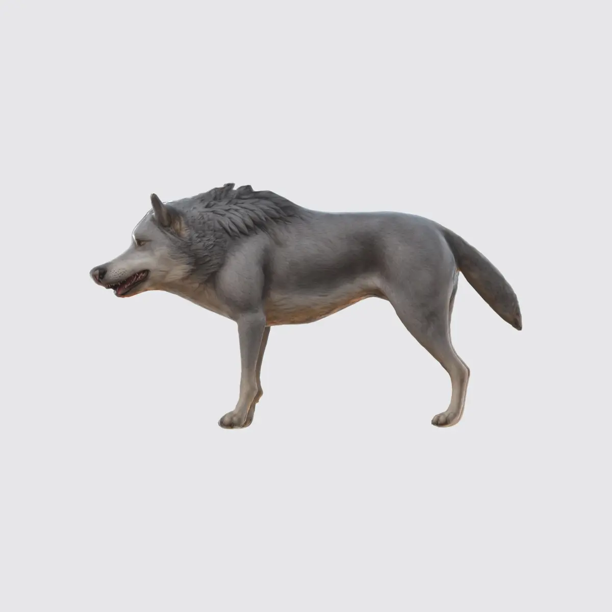 wolf is depicted with a sleek, muscular build, a thick, shaggy coat, and a keen, focused expression. The rendering showcases the wolf's intricate fur patterns, lifelike facial features, and the dynamic pose of its body, which suggests movement. The overall style of the image is a blend of realism and digital artistry, resulting in a highly convincing and visually striking representation of a wolf.