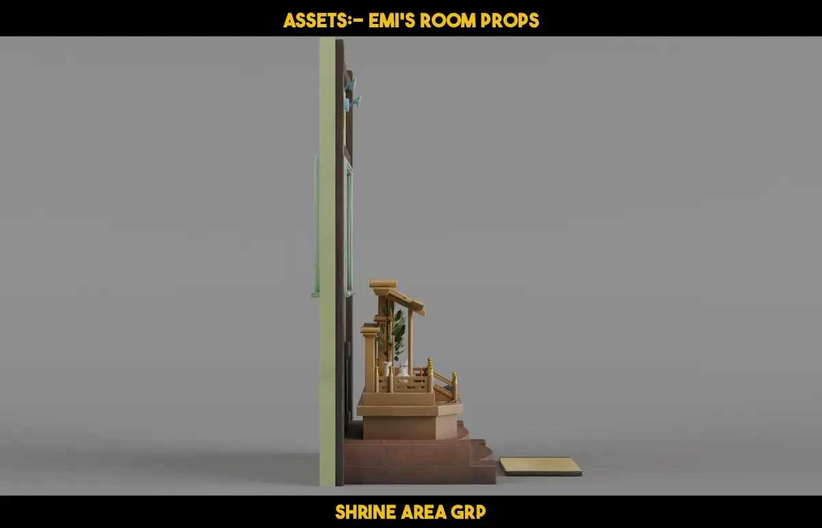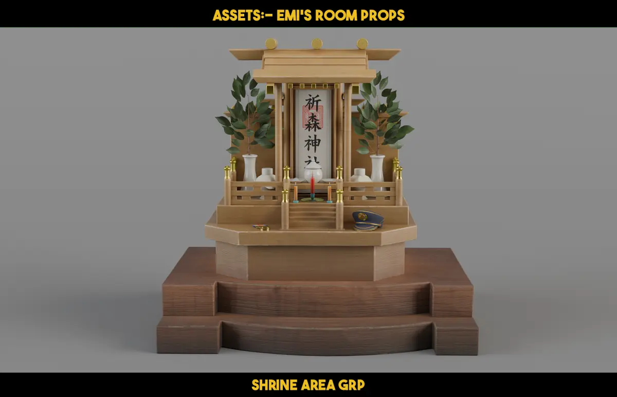 A Kyoto Room's – Shrine Area Props offers 20+ stylized Japanese spiritual and shrine elements, including incense burners, framed charms, candles, a small altar, and ancestral decor—all textured in 2K–4K PBR for render-ready performance in Blender or Unreal.