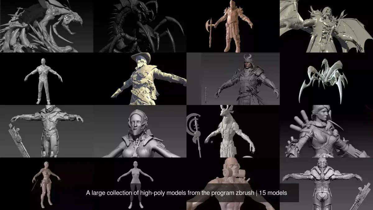 A large collection of high-poly models from the program zbrush