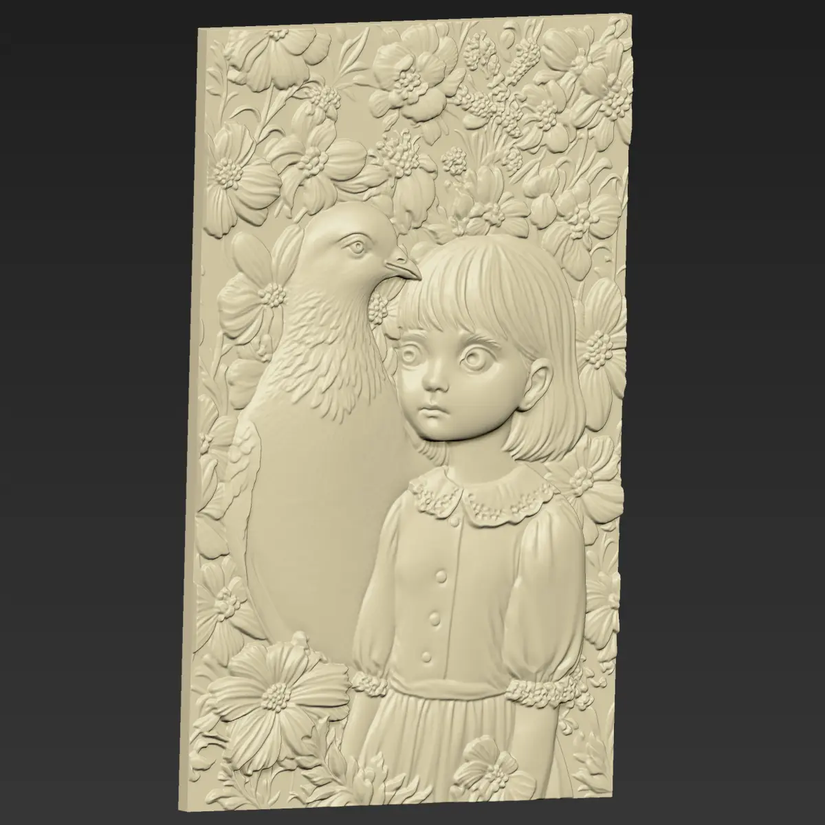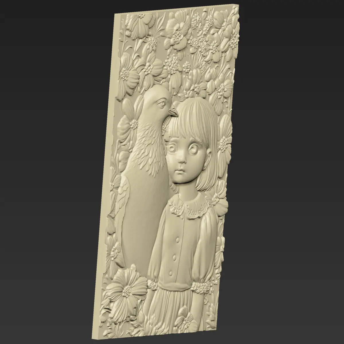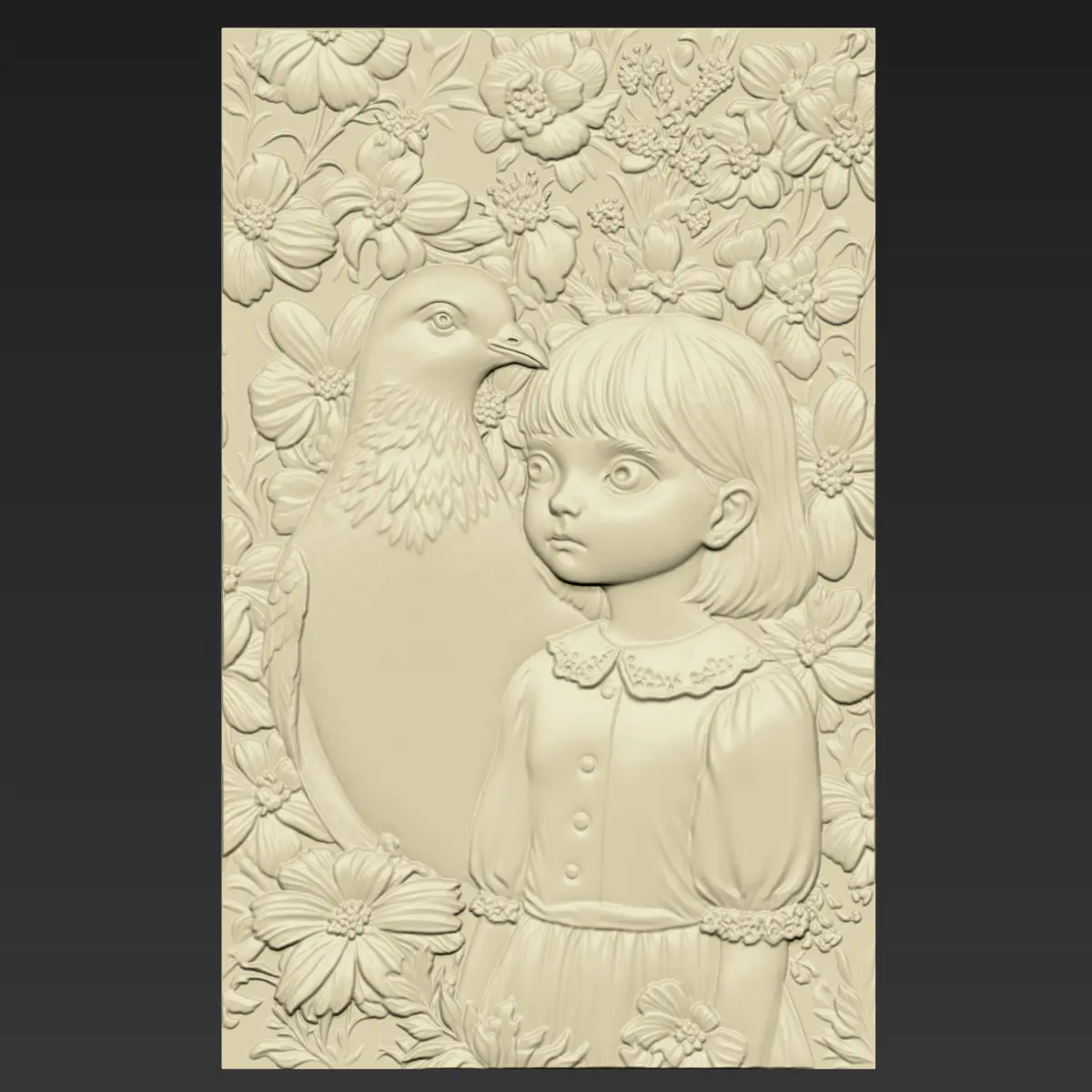 3d model of bas-relief of a little girl and pigeon ready for CNC Router Carving or 3d printer.OBJ,STL format.Note:All the models are not for resale,it is illegal!