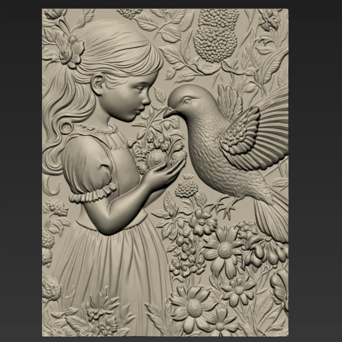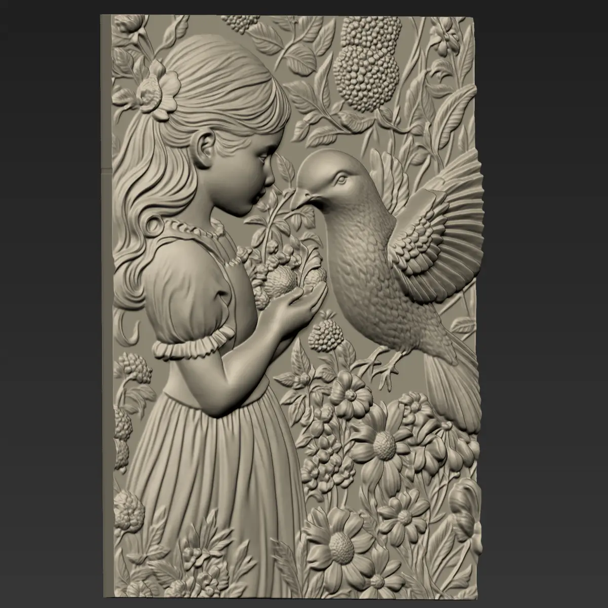 3d model of bas-relief of a little Girl feeding a pigeon ready for CNC Router Carving or 3d printer.OBJ,STL format.Note:All the models are not for resale,it is illegal!