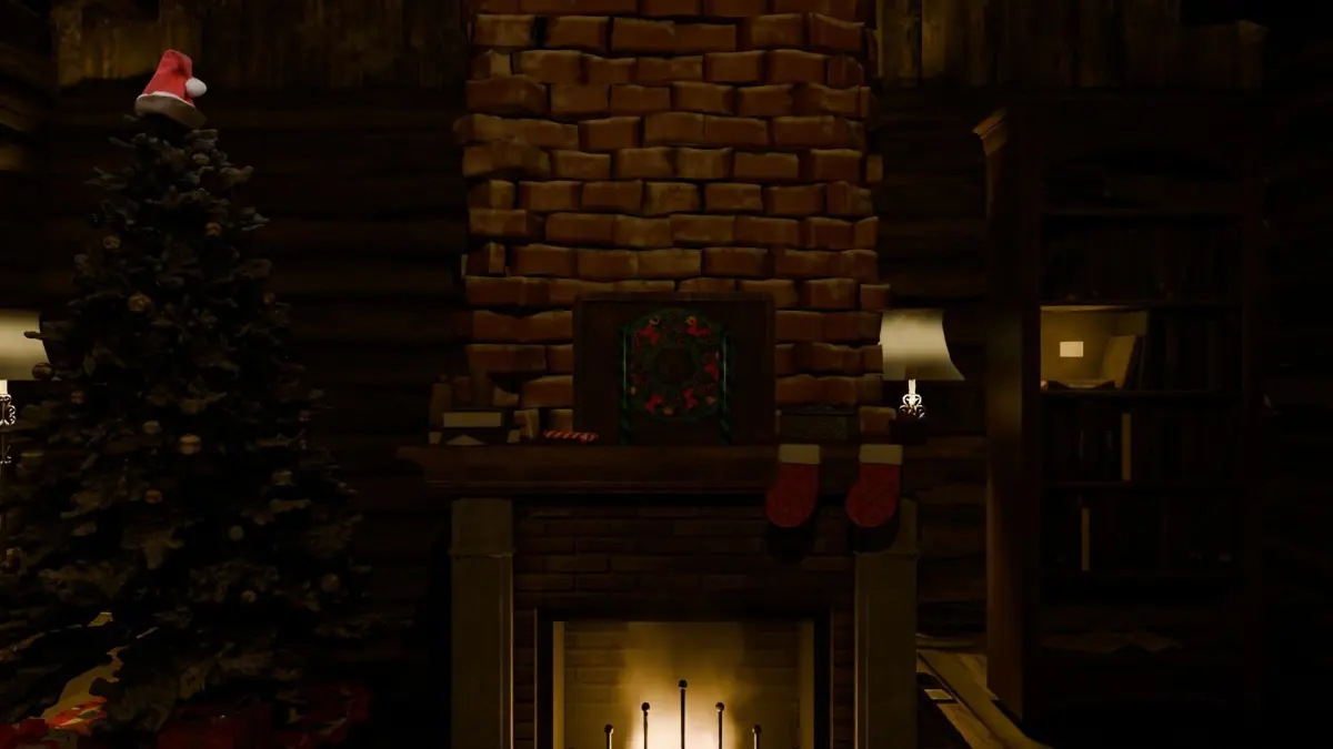 Soft light bulbs hang from the ceiling, casting a gentle glow throughout the hut and illuminating the festive decorations that adorn every corner. Above the doorway, a giant clock ticks away the hours, counting down to the most magical night of the year.