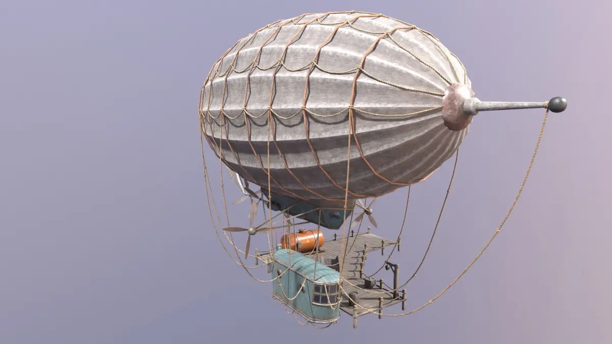 The airship, an elegant silhouette against the darkening sky, stands tied to a wooden pier. Next to it, an old gas station with rusted pumps recalls a bygone era. A battered wagon loaded with marked boxes shares the space with barrels, each of which tells stories about distant shores. The lanterns, swinging, cast a warm light, creating an atmospheric picture — a fleeting intersection of transport, trade and calm waiting for departure.