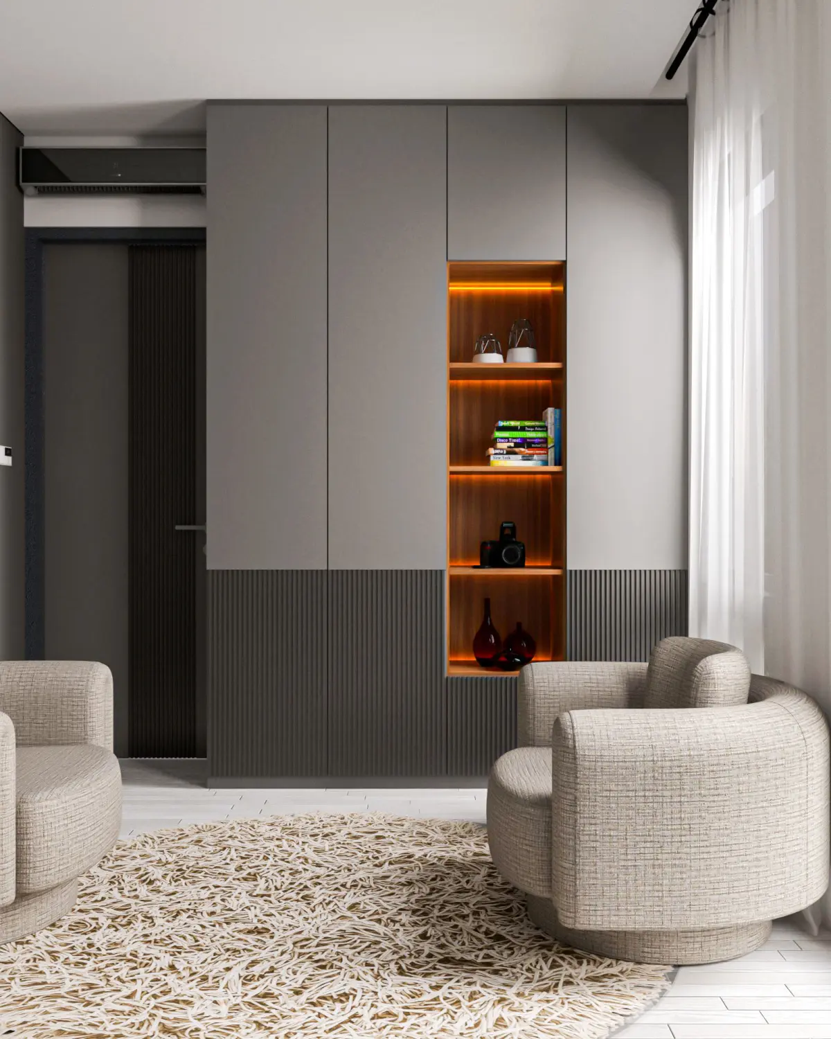 This home office is a perfect blend of luxury and functionality. The sleek lines and modern furniture create a sophisticated and stylish space, while the neutral color palette and natural light make it a relaxing and inviting place to work. The built-in bookshelves and ample desk space provide plenty of storage and workspace, while the comfortable seating and stylish accents add a touch of personality. This home office is sure to inspire productivity and creativity.