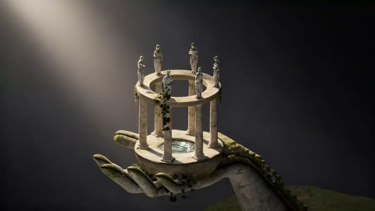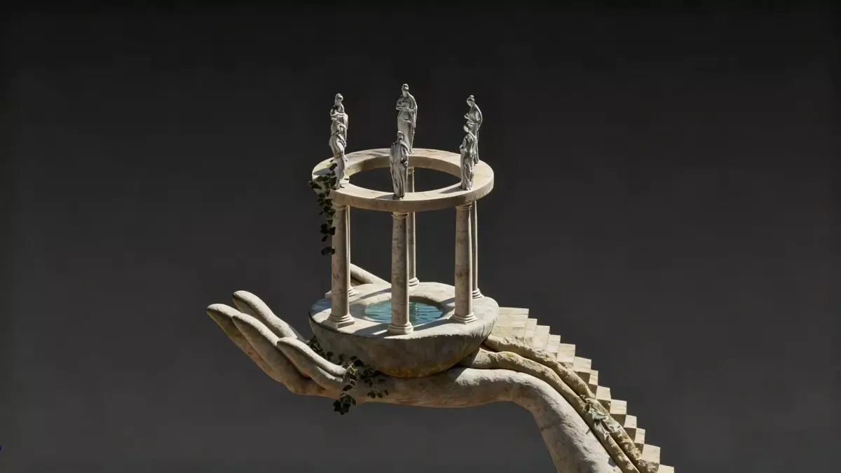 This is a work filled with surreal fantasy: a giant stone hand holds aloft a miniature circular temple in the ancient Greek style. The temple is supported by several columns, with multiple classical human statues standing on the circular platform at the top. A shallow pool of clear water is embedded in the palm of the hand, and vines cling naturally along the edges of the hand and the temple. There is even a flight of stone steps extending from the palm to the outside of the hand, as if leading to this secret aerial realm.Overall, it combines the heaviness of the stone texture, the delicacy of classical architecture, and the surreal composition of a giant hand holding a miniature building. It not only retains the solemn aesthetics of ancient Greek sculpture but also creates a mythical floating atmosphere through fantasy settings, resembling a scene stripped from a dream that blends classicism and surrealism.