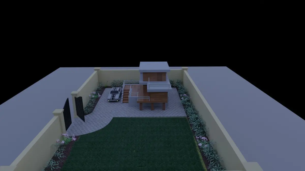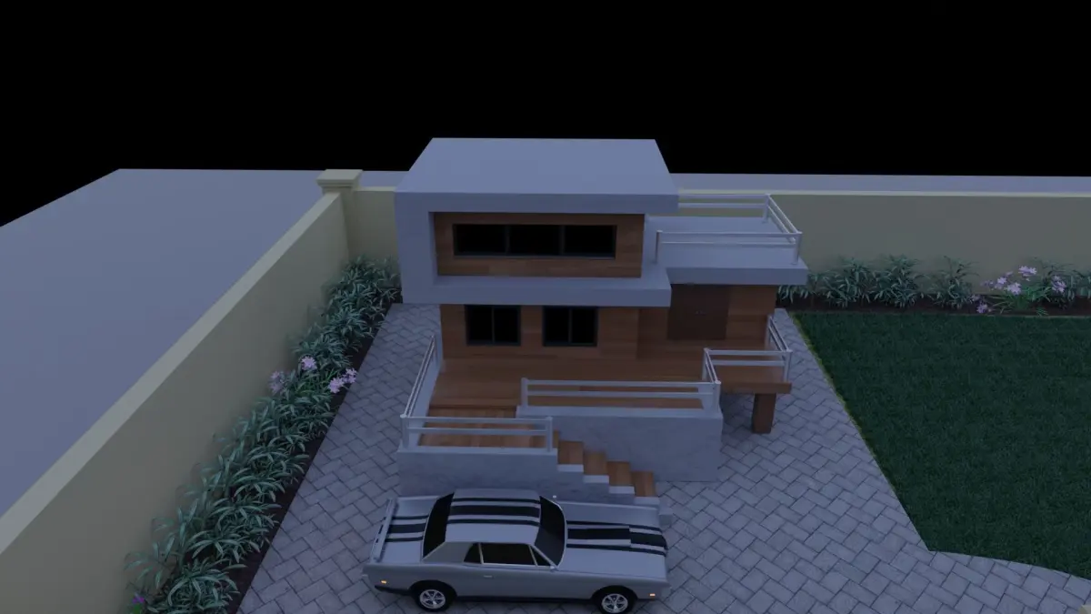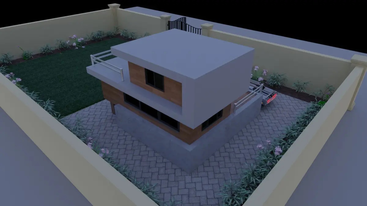 This is a modern house with 3 floors and a large beautiful garden. The ground floor is a little elevated. The balcony is on top floor. It has 6 windows in total.(The car is made by another freelancer, you can find it free by messaging me).