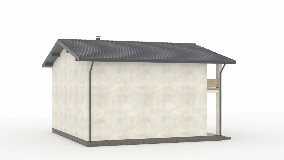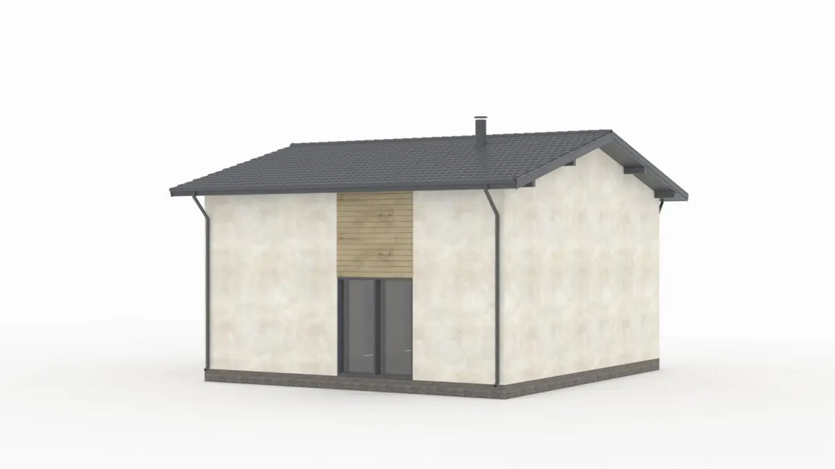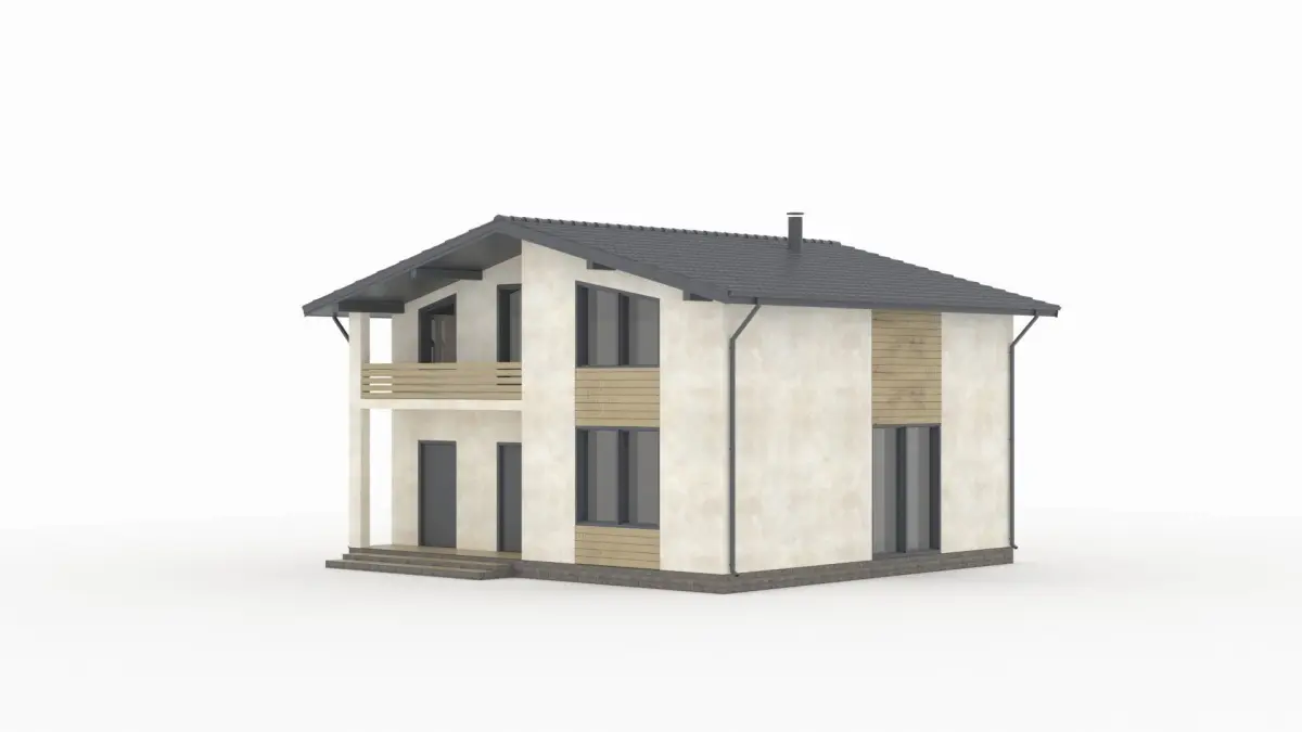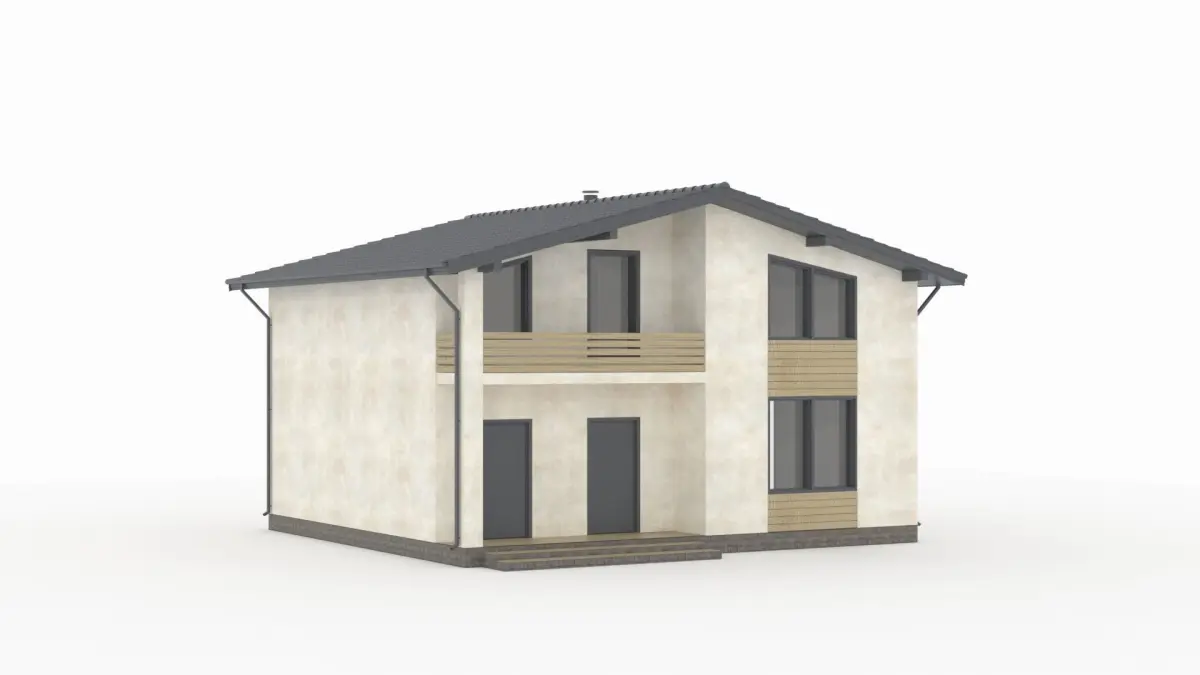 3D model of a modern residential house with a slanted roof, large windows, and wooden balcony accents. The minimalist design features a clean beige facade, contemporary architecture, and an open layout concept. Ideal for architectural visualization, real estate presentations, or 3D rendering projects.