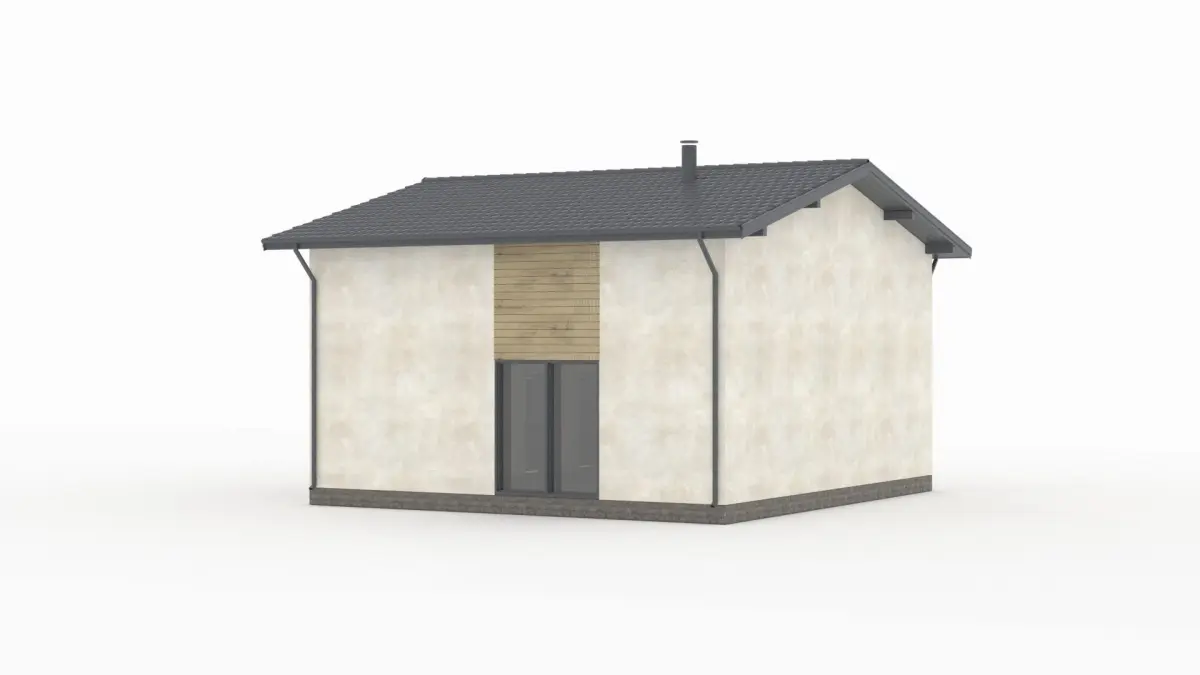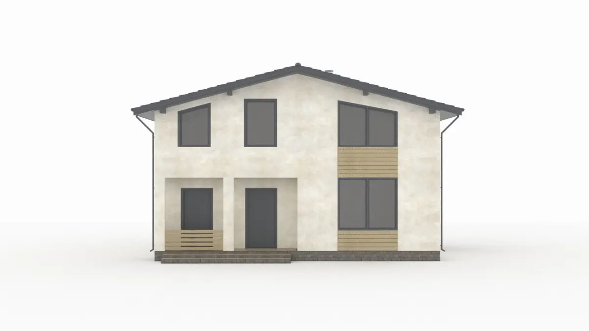 3D model of a modern residential house with a slanted roof, large windows, and wooden balcony accents. The minimalist design features a clean beige facade, contemporary architecture, and an open layout concept. Ideal for architectural visualization, real estate presentations, or 3D rendering projects.