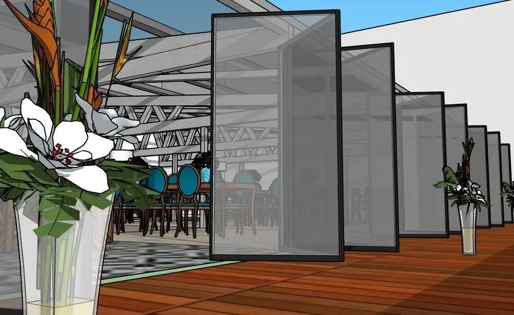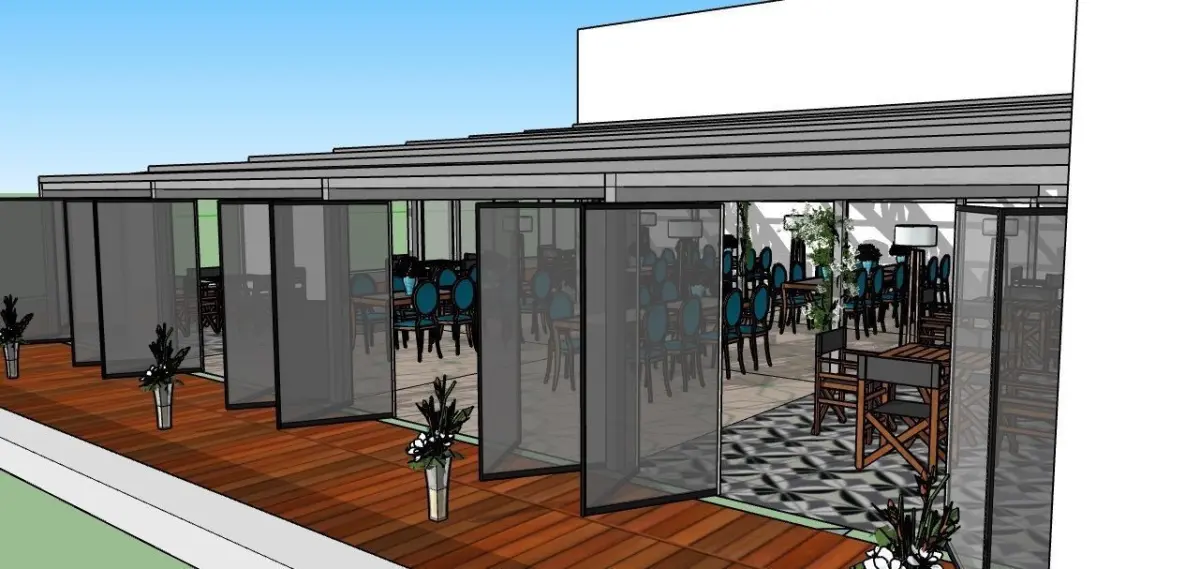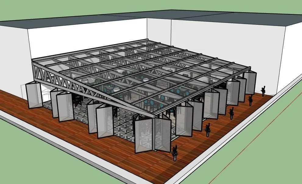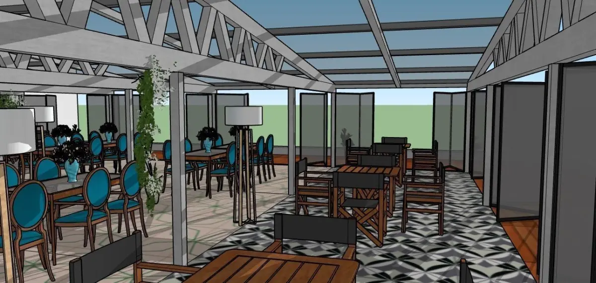 Restaurant for 100 seats with stained glass windows and doors - a book. The calculated truss for the given area together with the load.