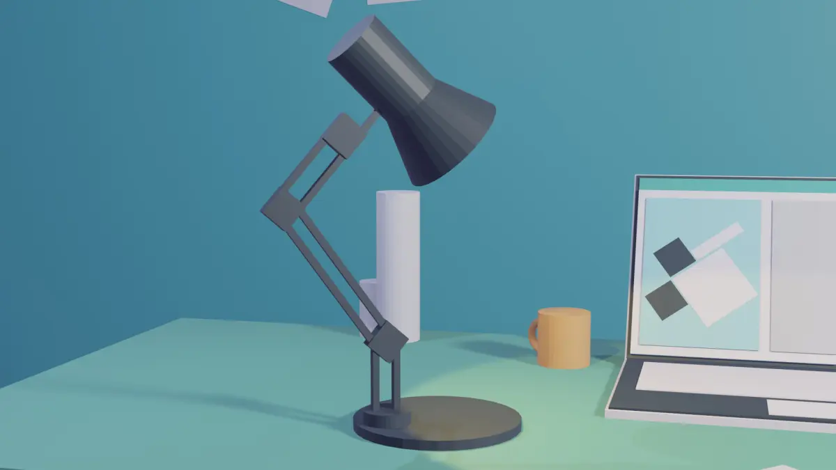 The scene depicts a low-poly room in turquoise and pastel hues. In the foreground, a desk holds a laptop displaying a graphic design program. A flexible desk lamp, notepad, sticky notes, and a stack of books are also present. In the background, a white bookshelf holds books and decorative geometric shapes. The scene is lit with a soft light, creating a cozy atmosphere.