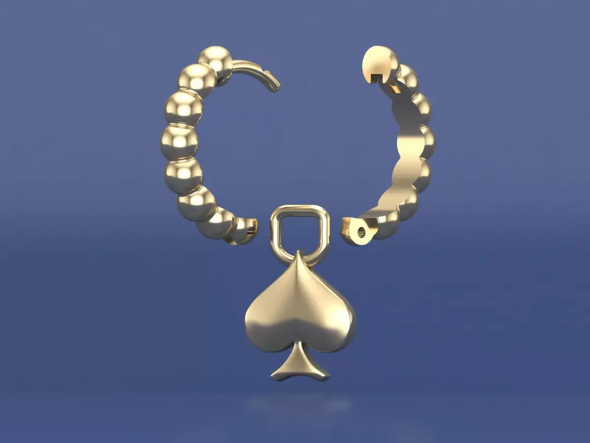 Product Description: Poker Set Bead Hoop Earrings (3D Printable File)Add a playful yet elegant touch to your jewelry collection with this Poker Set Bead Hoop Earrings Design, perfect for 3D printing enthusiasts and jewelry makers. This captivating set features beaded hoop earrings adorned with dangling poker-themed charms, including Heart, Club, Diamond, and Spade symbols, making it ideal for card game lovers or anyone who enjoys unique statement pieces.Key Features:Poker-Themed Charms: Includes four iconic poker suit symbols (Heart, Club, Diamond, and Spade), each designed with smooth curves and polished details for a sophisticated finish.Beaded Hoop Design: The hoops are crafted with a textured bead pattern, adding depth and elegance to the overall look.Interchangeable Charms: The design allows for easy customization, enabling wearers to mix and match charms or wear them individually.3D Printable File: High-resolution digital model optimized for 3D printing, ensuring precise detailing and easy assembly.Benefits:Perfect for creating personalized jewelry or offering themed designs to customers.Compatible with various printing materials, including resin, metal, and plastic.Ideal for jewelers, designers, and hobbyists looking to craft unique earrings with professional-grade quality.