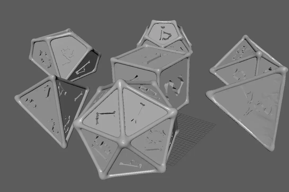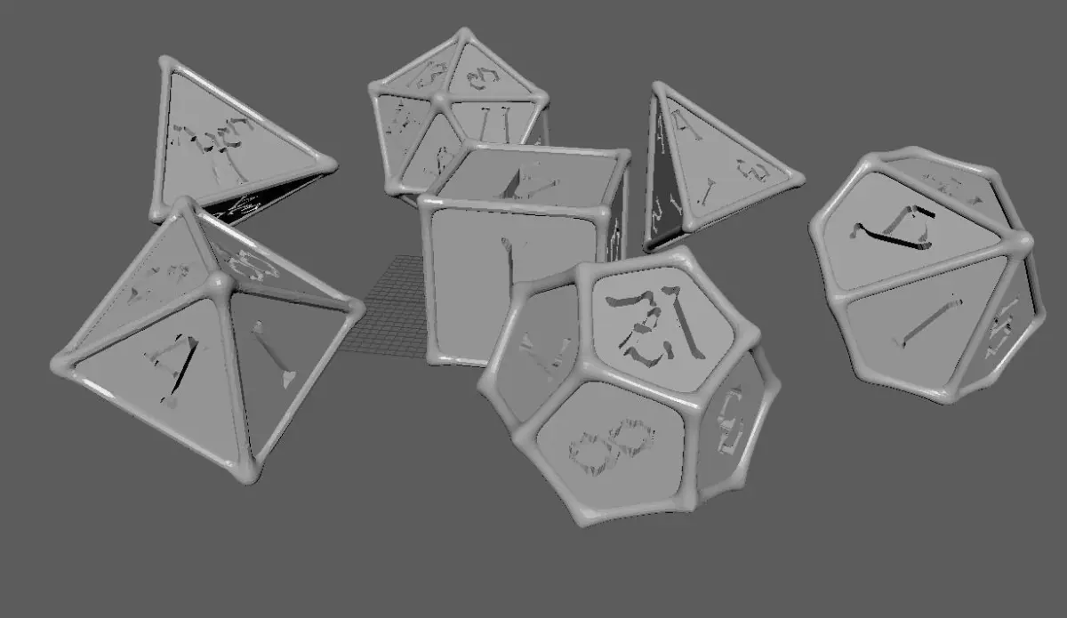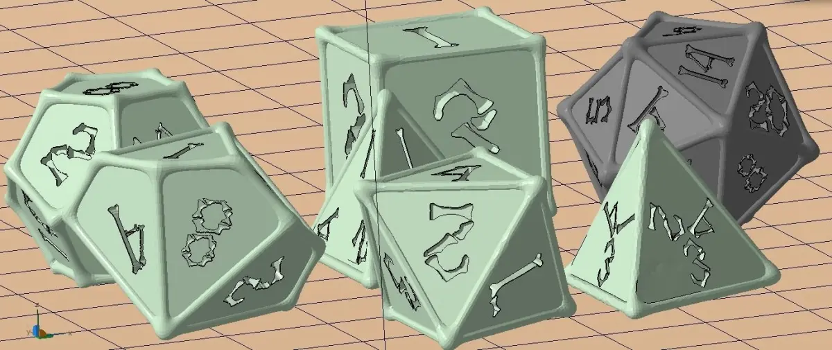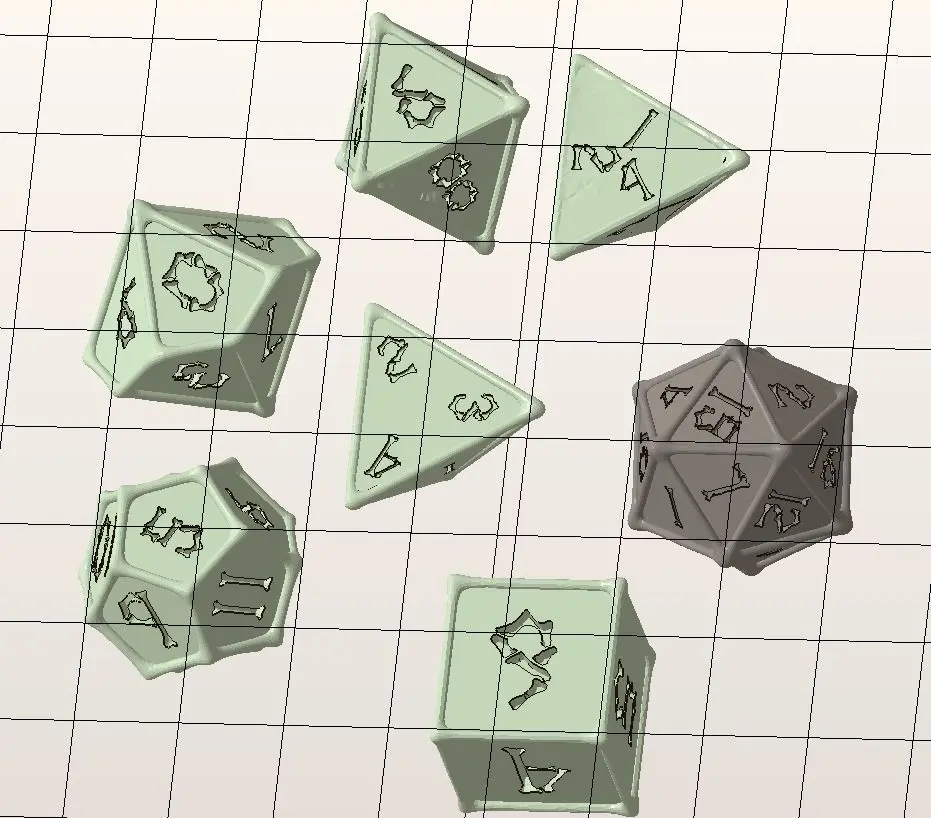 A set of Polyhedral Dice font in the shape of the bonesThe set contains: D4 (x2 versions) D6 D8 D10 D12 D20 Modelled in Maya 2019 and exported in Autodesk Netfabb PremiumExported in a range of other formats for your convenience.I hope you enjoy using it!This is my first project