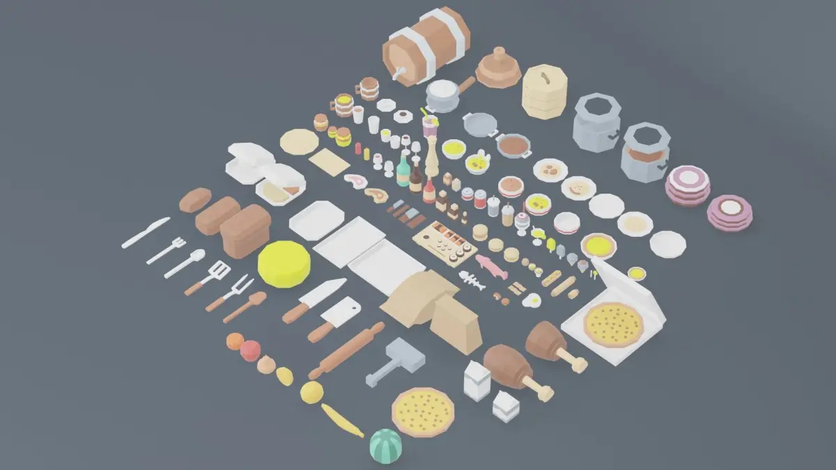 3D models A set of products drinks kitchen utensils made in the program blender 3D render cycles used and EEVEE can see in the images also the renderer filter is used the stroke can be seen on render cycles. The set is low poly and can be used in games or animations. In the set -
